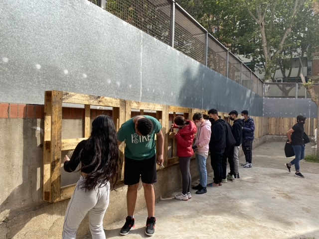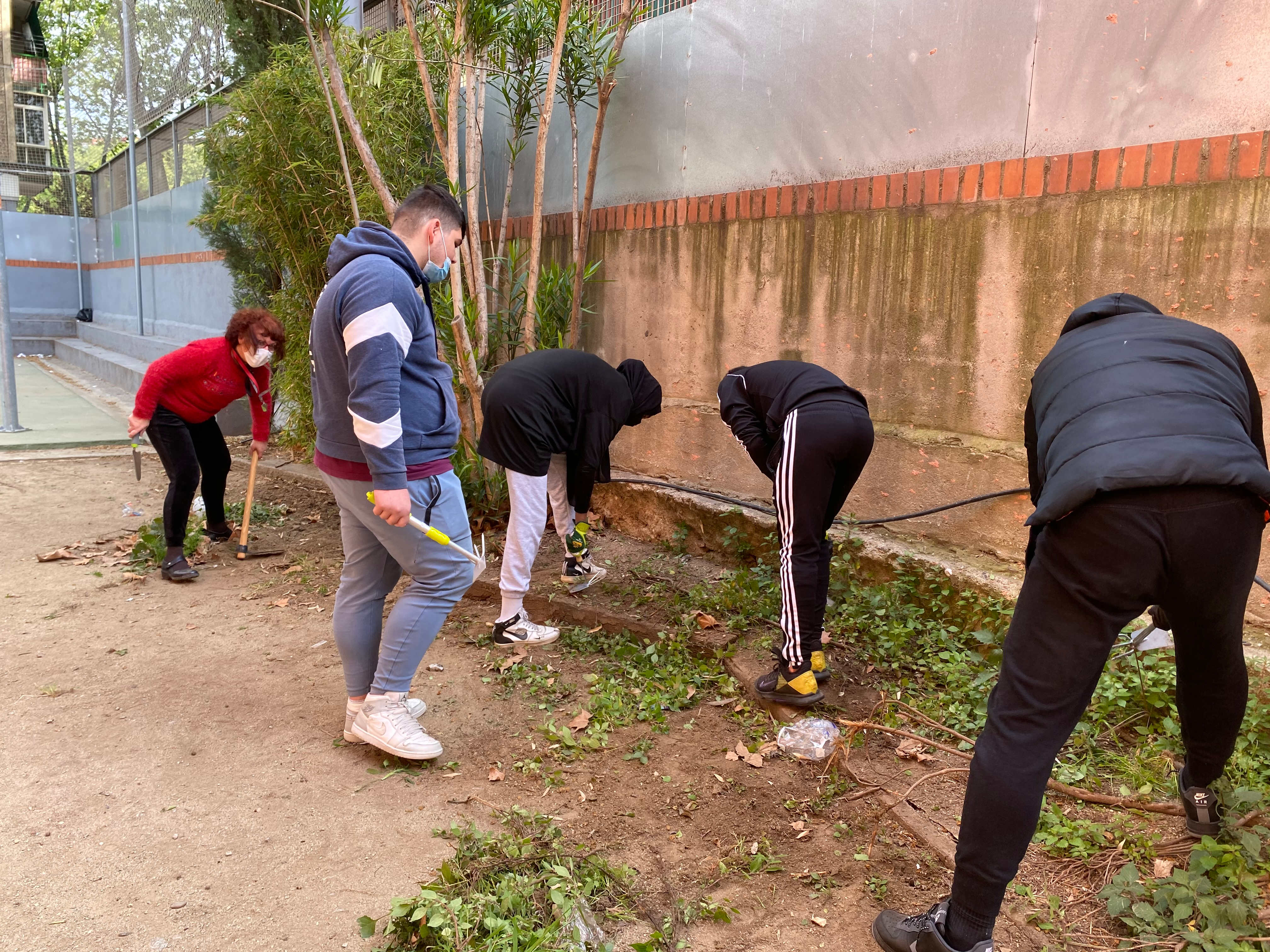 La professora Inmaculada Sánchez i el professor Marc Leal els acompanyen en aquesta tasca que està canviant l’aspecte dels espais exteriors de l’institut.