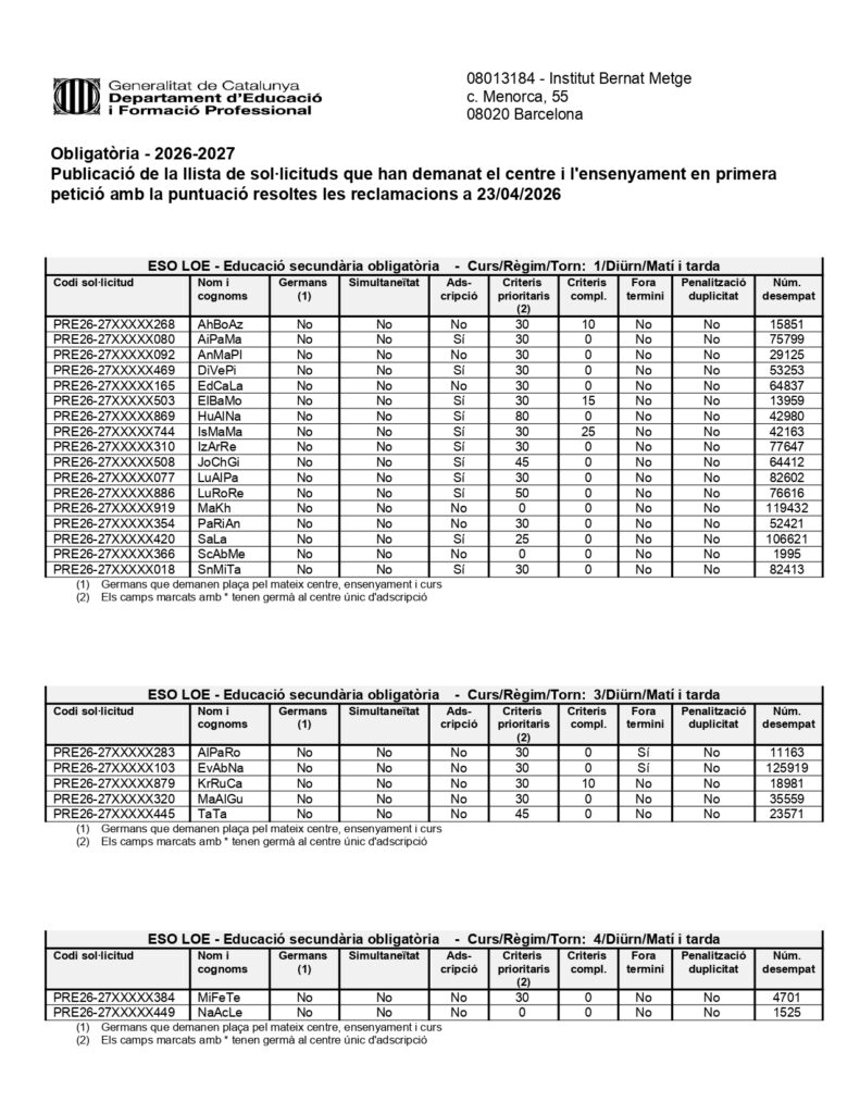 • Baremació definitiva ESO curs 26/27. Sol·licituds Institut Bernat Metge 1ra petició!