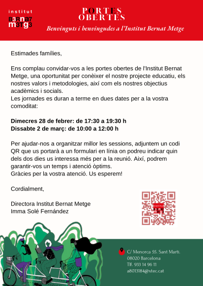 En referència les portes obertes de post-obligatòria, de moment des de l’institut no n’hem fet previsió tot esperant dates de preinscripció.