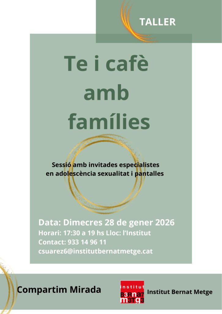 Us convidem el dimecres 28 de gener, de 17:30 a 19:00 h, a l’Institut per participar de la tercera sessió del “Te i cafè amb famílies”! ☕🍵