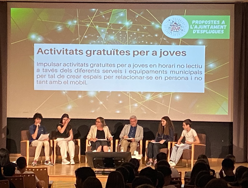 En aquesta trobada, a més de tots els estudiants de 4t d’ESO dels diferents instituts d’Esplugues de Llobregat, també hi ha assistit l’alcalde acompanyat d’alguns regidors que han recollit les propostes exposades per tal de poder-les treballar des de l’ajuntament.