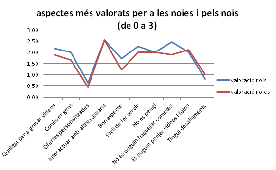 Pel que fa als aspectes més valorats de la xarxa, del 0 al 3, no hi ha gaire diferències ni per gènere ni per edat, com es pot observar en els següents gràfics: