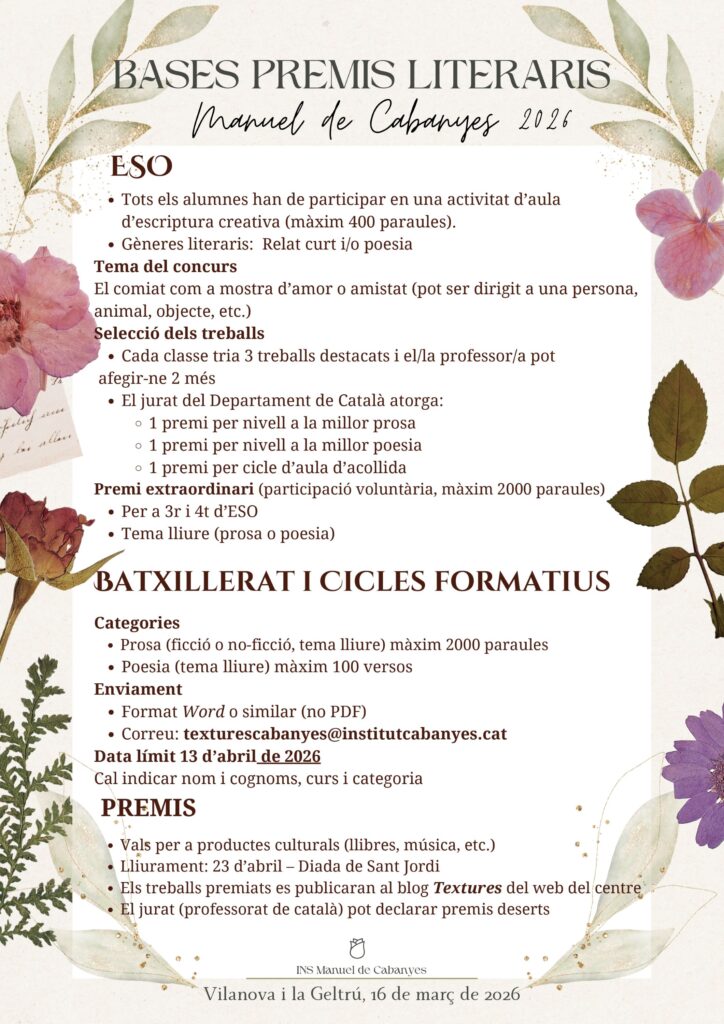 El concurs inclou diferents categories de prosa i poesia, així com un premi extraordinari per a 3r i 4t d’ESO. Els treballs s’hauran de presentar abans del 13 d’abril de 2026.