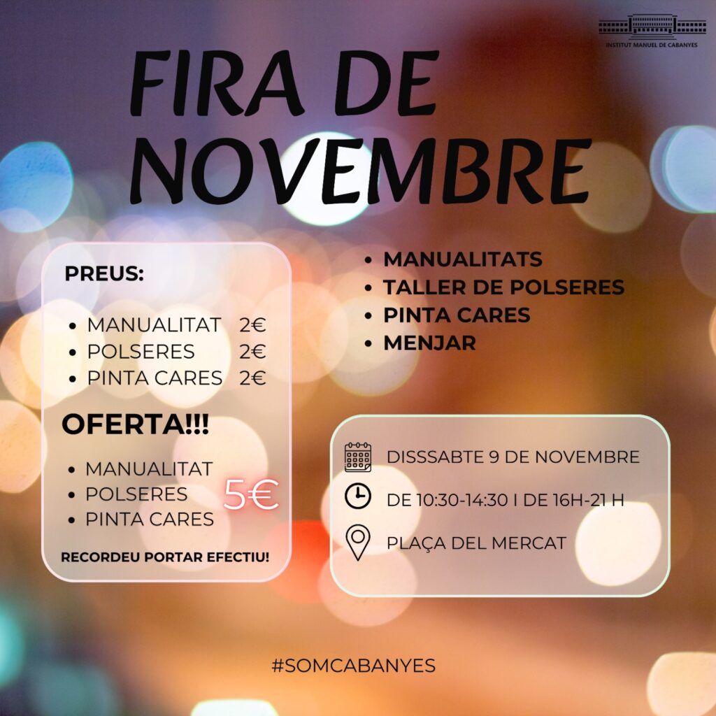Tenim un stand a la Fira de Novembre! Redacció08/11/24 L’alumnat de 4t d’ESO estarà demà, de 10:30 a 14:30 h. i de 16 a 20 h., a la Plaça del Mercat fent tallers per la canalla i venent números de la panera de Nadal per recaptar diners per al seu viatge de fi de curs. Passeu a veure’ls! Us hi esperen!