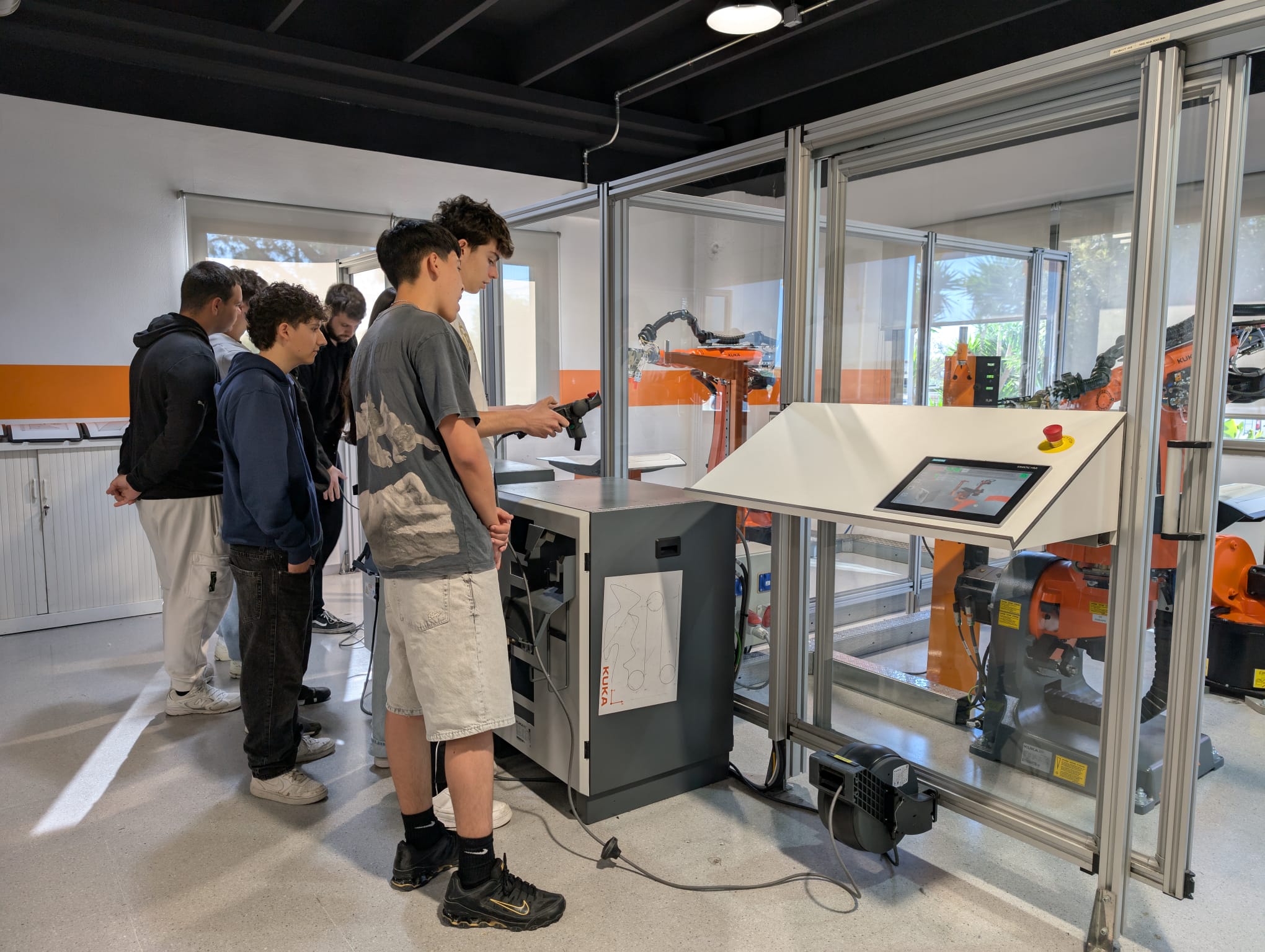 Ahir, l’alumnat de les optatives de robòtica i programació de 1r de batxillerat va visitar l’empresa KUKA, a Vilanova i la Geltrú. Després d’una presentació sobre la filosofia de l’empresa i el funcionament dels robots industrials, van poder fer pràctiques a l’aula de formació amb tres robots d’entrenament, treballant tant el control dirigit com el control programat. Va ser una activitat exigent però molt profitosa, que va permetre posar en pràctica els coneixements apresos a l’aula. Agraïm especialment a l’Eliot la seva tasca com a formador i a KUKA per oferir-nos aquesta oportunitat d’aprenentatge tan completa.