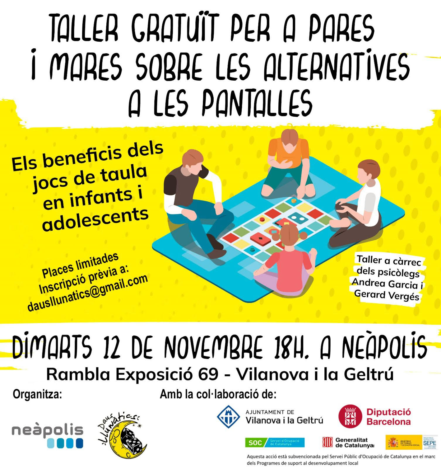 Ens complau anunciar que pròximament organitzarem un taller gratuït per pares, mares, tutors i professionals del món educatiu on parlarem dels beneficis dels jocs de taula per estimular i treballar diferents aspectes del desenvolupament; llenguatge, atenció, comunicació, socialització,… i ho treballarem de manera pràctica amb una selecció de jocs que hem fet.