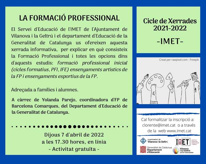 - Dijous 07/04. 17:30, “LA FORMACIÓ PROFESSIONAL”, inscripció prèvia -gratuïta- al següent formulari o a l’adreça de correu electrònic clorente@imet.cat.