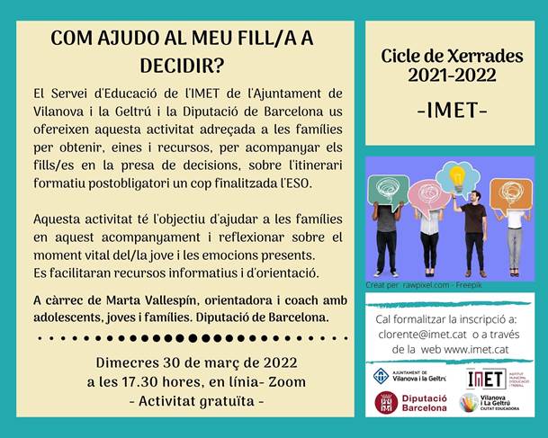 - Dimecres 30/03, 17:30, “COM AJUDO AL MEU FILL/FILLA A DECIDIR?”, inscripció prèvia -gratuïta- al següent formulari o a l’adreça de correu electrònic clorente@imet.cat