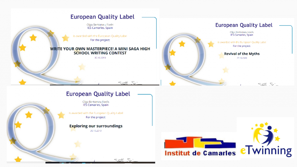 El curs passat degut a la pandèmia no es van poder donar els segells de qualitat europeus dels projectes eTwinning del curs anterior i ara acabem de rebre la notificació que en els tres projectes que teníem a 4t d’ESO el curs 18-9 hem rebut de tots tres Segell de Qualittat Europeu. Aquests projectes ja havien rebut els segells de qualitat nacional i ara l’Europeu, per tant felicitem als alumnes que ara fan 2n de BAT per la seva bona feina! Enhorabona a tots!!!