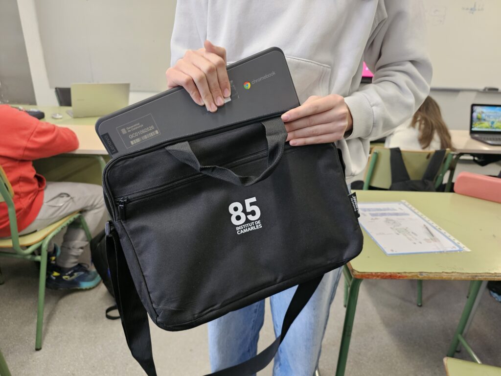 Aquest tercer trimestre, l’alumnat de 1r d’ESO inicia la incorporació de les tecnologies educatives en el seu procés d’aprenentatge. Amb aquest objectiu, el centre els ha cedit un Chromebook configurat per a ús educatiu i, com a novetat, també una funda protectora per facilitar-ne el transport amb seguretat.