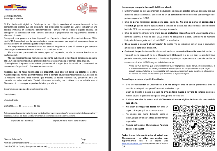 Abans del préstec, l’alumne i la família han de signar el full de préstec, on es recullen les indicacions d’ús i conservació i la normativa que aplica. Aquest Chromebook s’ha de tornar quan es deixa l’ESO, sigui per passar a Batxillerat o per deixar l’Institut.