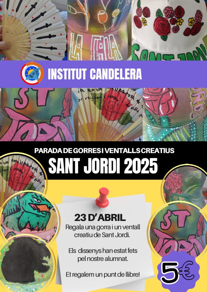 El 23 d’abril, l’Institut Candelera va celebrar la diada de Sant Jordi amb una jornada plena d’activitats participatives i una gran implicació de l’alumnat i el professorat. L’alumnat de la matèria de Plàstica van exposar i vendre gorres i ventalls dissenyats i elaborats per ells mateixos, mentre que el de 3r d’ESO van vendre roses