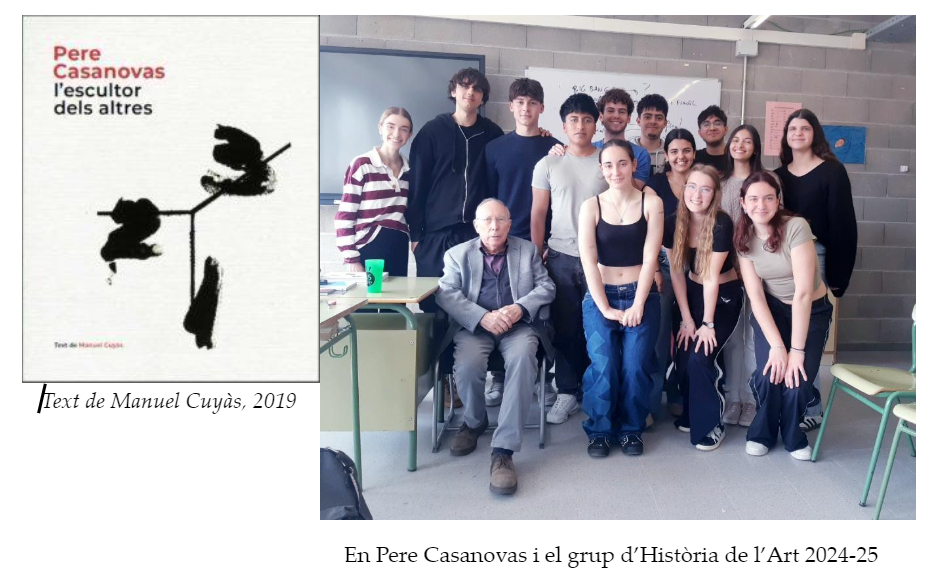 Avui en Pere ha vingut a explicar-nos el què és per ell l’art, d’on surt i el que vol expressar. Ens comenta amb convicció que l’art és emoció i creació, un impuls que surt de dins de cadascun de nosaltres i que d’alguna manera connectarà lliurement amb l’observador. Natura, art, ciència, tot està relacionat i forma part del mateix univers. En Pere Casanovas considera que si amb les paraules n’hi hagués prou, no existiria l’art. Ens explica que el llenguatge visual, sigui escultura, pintura o qualsevol altre, omple de poètica la nostra quotidianitat i ens fa establir connexions inesperades amb el nostre interior.