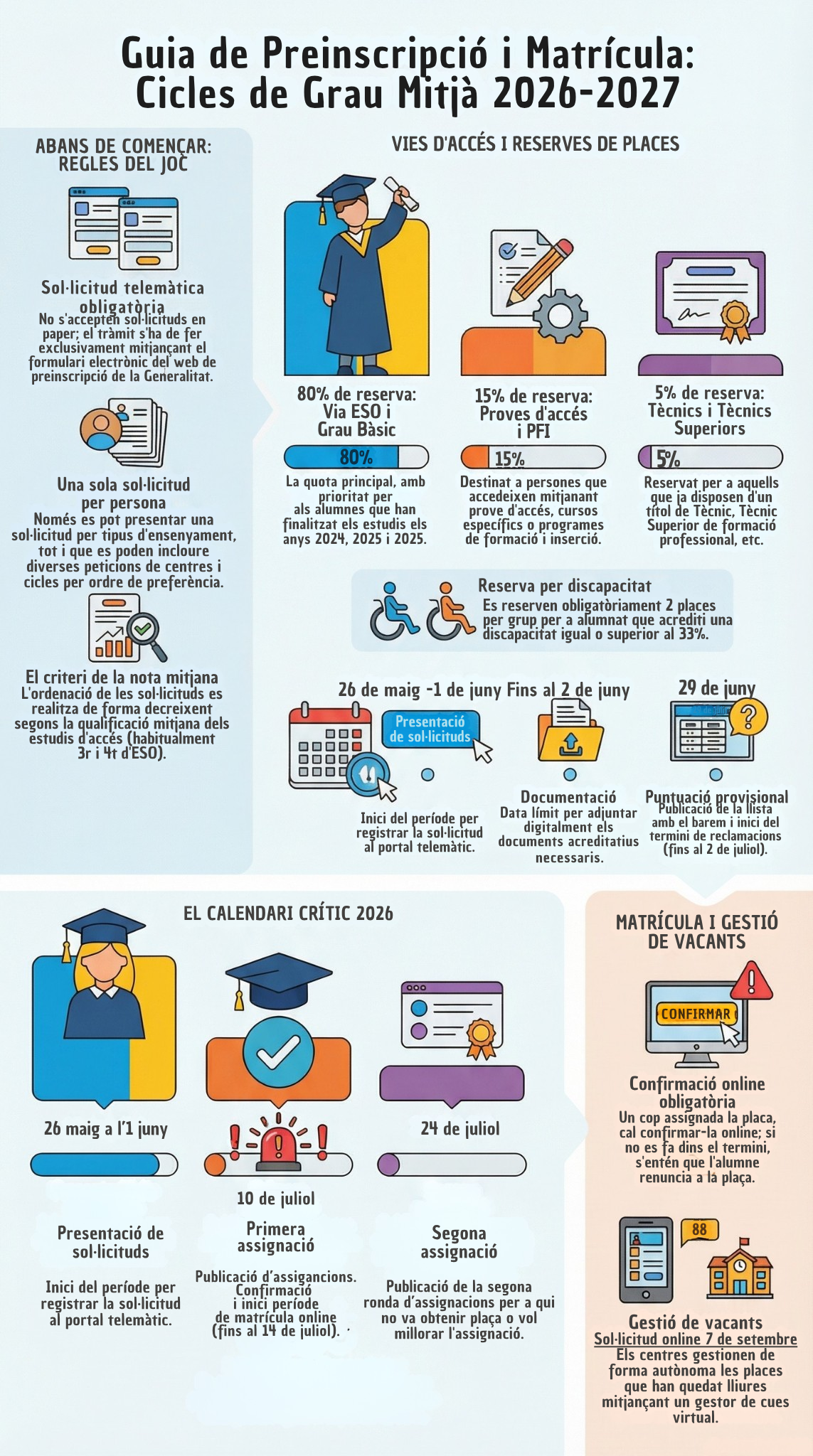 El dia 10 de juliol comença l’assignació de places d’FP a grau mitjà. Es farà en 3 tandes: el dia 10, el dia 18 i el dia 29 de juliol. En aquest vídeo expliquem tot el procés.