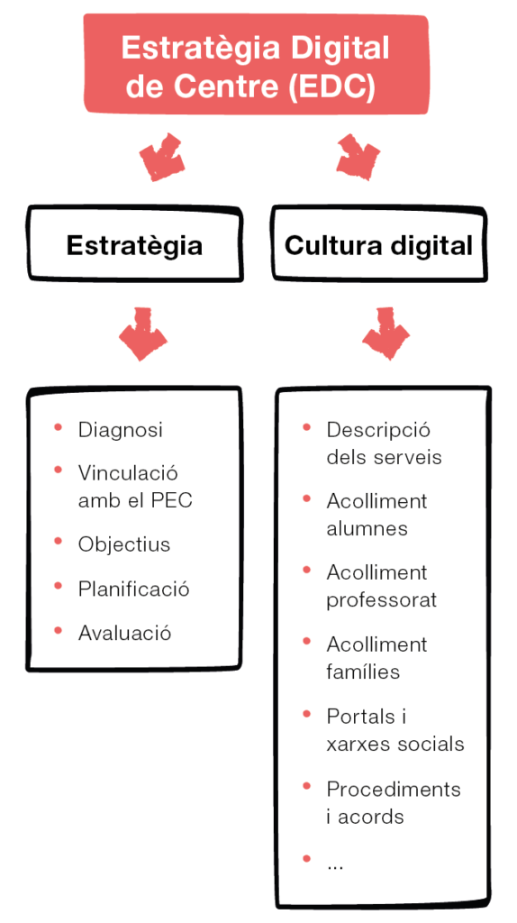 L’EDC té, bàsicament dues parts. Una primera part que és més estratègica (objectius, activitats, planificació, etc.), on es defineix on vol arribar el centre digitalment parlant. La segona part mostra la cultura digital, ja que és on es va recollint el que el centre ja té establert en aquest sentit.