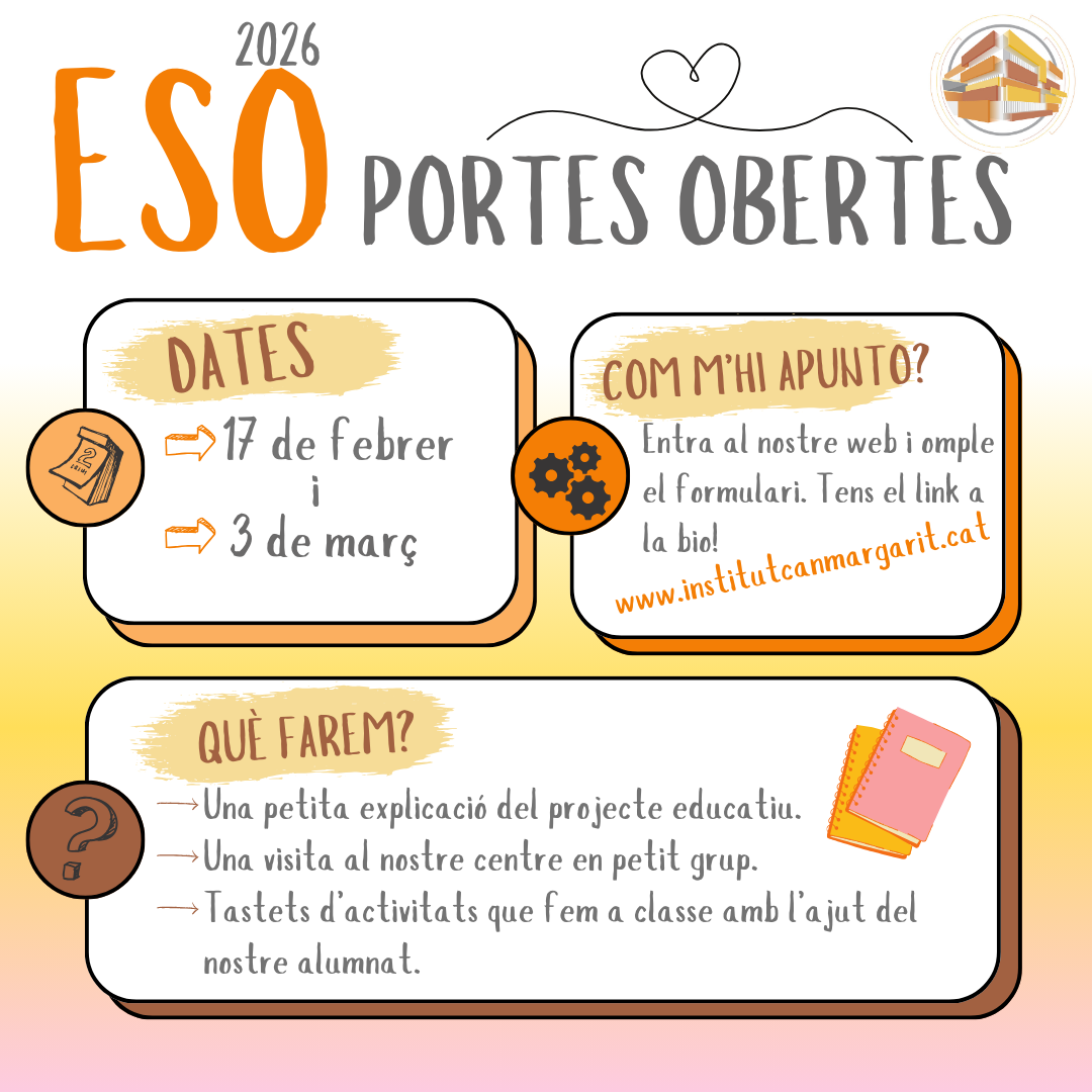Enguany les Portes Obertes del nostre centre seran els dies 17 de febrer i 3 de març. Creiem que és molt important que feu una presa de contacte amb el nostre centre molt personalitzada, per aquest motiu, hem preparat visites en petit grup en diferents horaris perquè vingueu quan us vagi millor.