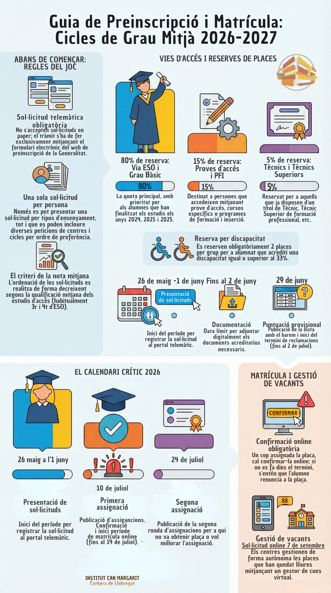 Presentació de les sol·licituds de preinscripció: del 6 al 18 de març de 2026 Més informació en el següent ENLLAÇ. Els centres adscrits a l’INS Can Margarit són: Les dates de matricula són: del 22 al 30 de juny.