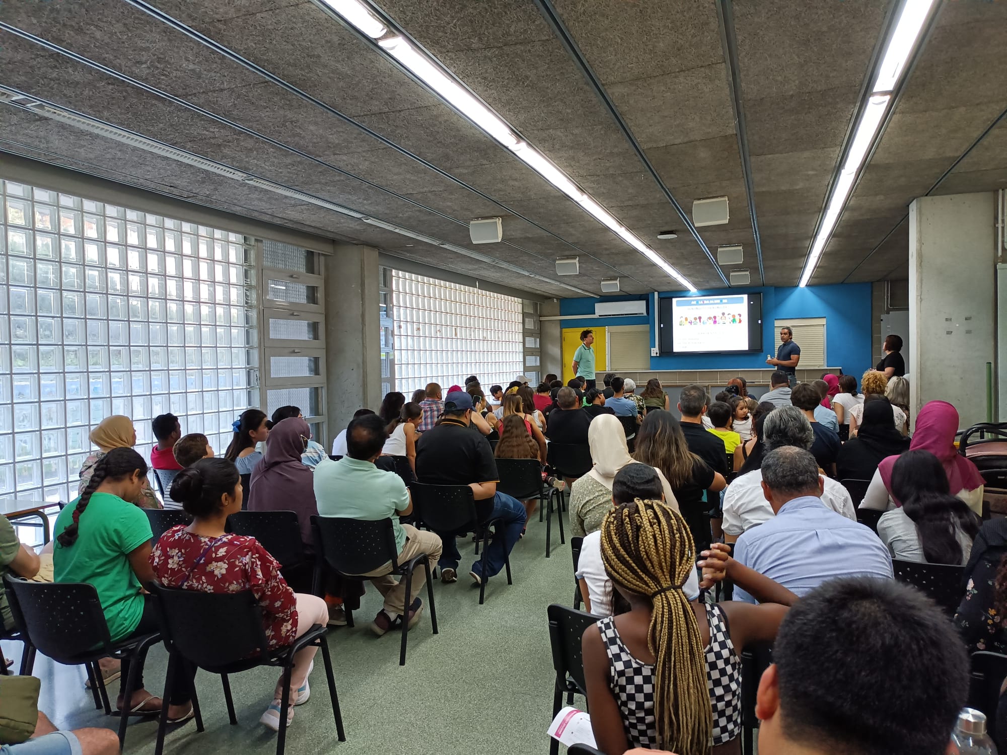 Adjuntem una fotografia d’una aula plena de famílies com a mostra i la presentació que resumeix la informació proporcionada.