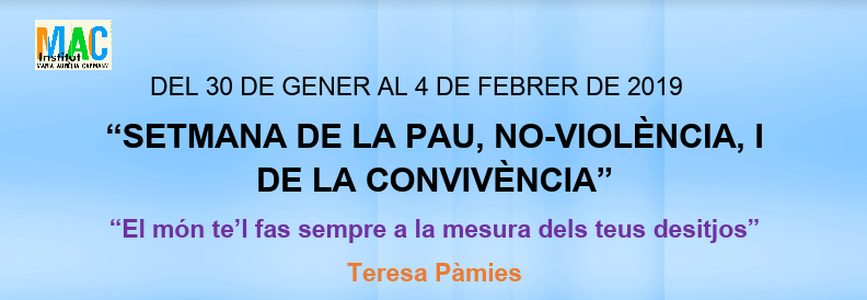 Del 30 de gener al 4 de febrer celebrarem la Setmana de la No-violència, la Pau i la Convivència, per commemorar el DENIP (Dia Escolar per la No-violència i la Pau), que se celebra cada 30 de gener en commemoració de l’aniversari de la mort de Mahatma Gandhi. Aquí podeu veure el programa: