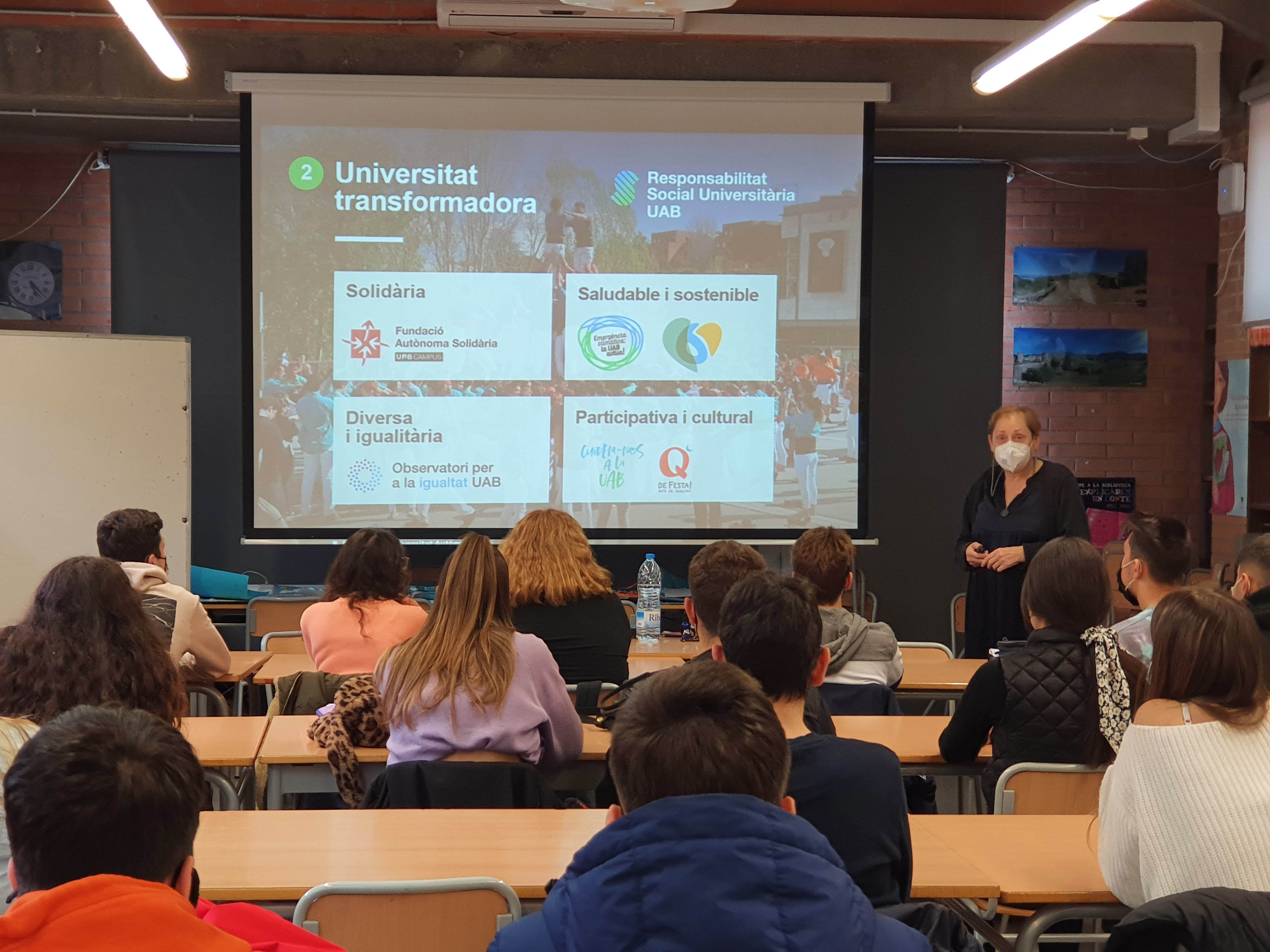 Aquest dijous 22, els alumnes de 2n de Batxillerat han rebut la visita de la UAB (Universitat Autònoma de Barcelona). És la segona xerrada dins del programa d’orientació universitària a 2n de Batxillerat. La Sra. Àngels Campà ha explicat als nostres alumnes els Graus que ofereix la UAB i com s’organitza el seu campus universitari, així com les notes de tall aproximades de cada especialitat. Agraïm molt a la Sra. Campà la seva visita i els seus consells a l’hora de fer una bona tria de futur.