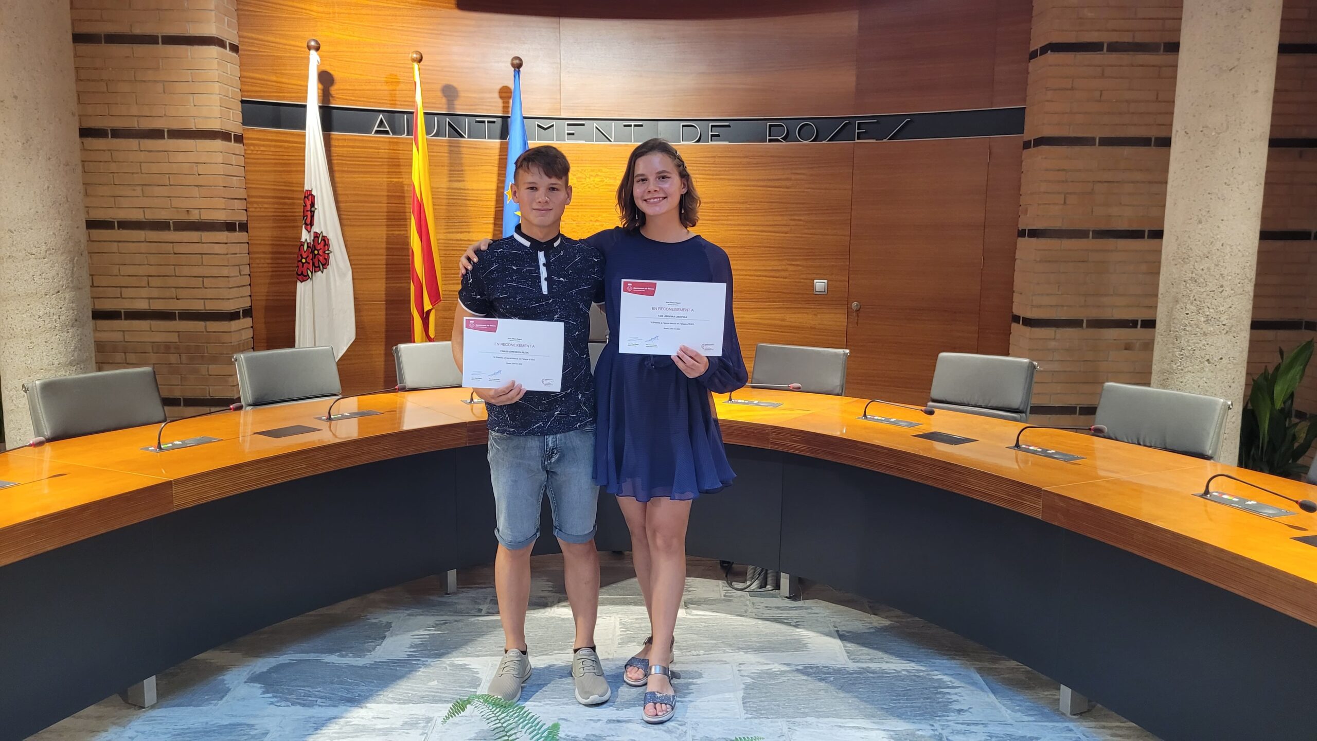 El passat dimecres 20 de juliol es va celebrar la sisena edició dels Premis a l’Excel·lència d’ESO, amb un acte que va tenir lloc a la sala de plens de l’Ajuntament de Roses. Els guardons premien i reconeixen els dos alumnes de cada institut de Roses que han destacat per l’excel·lència dels seus resultats acadèmics durant l’etapa d’Educació Secundària Obligaròria. Els premis van ser lliurats per l’alcalde de Roses, Joan Plana, i pel regidor d’Ensenyament, Marc Danés.