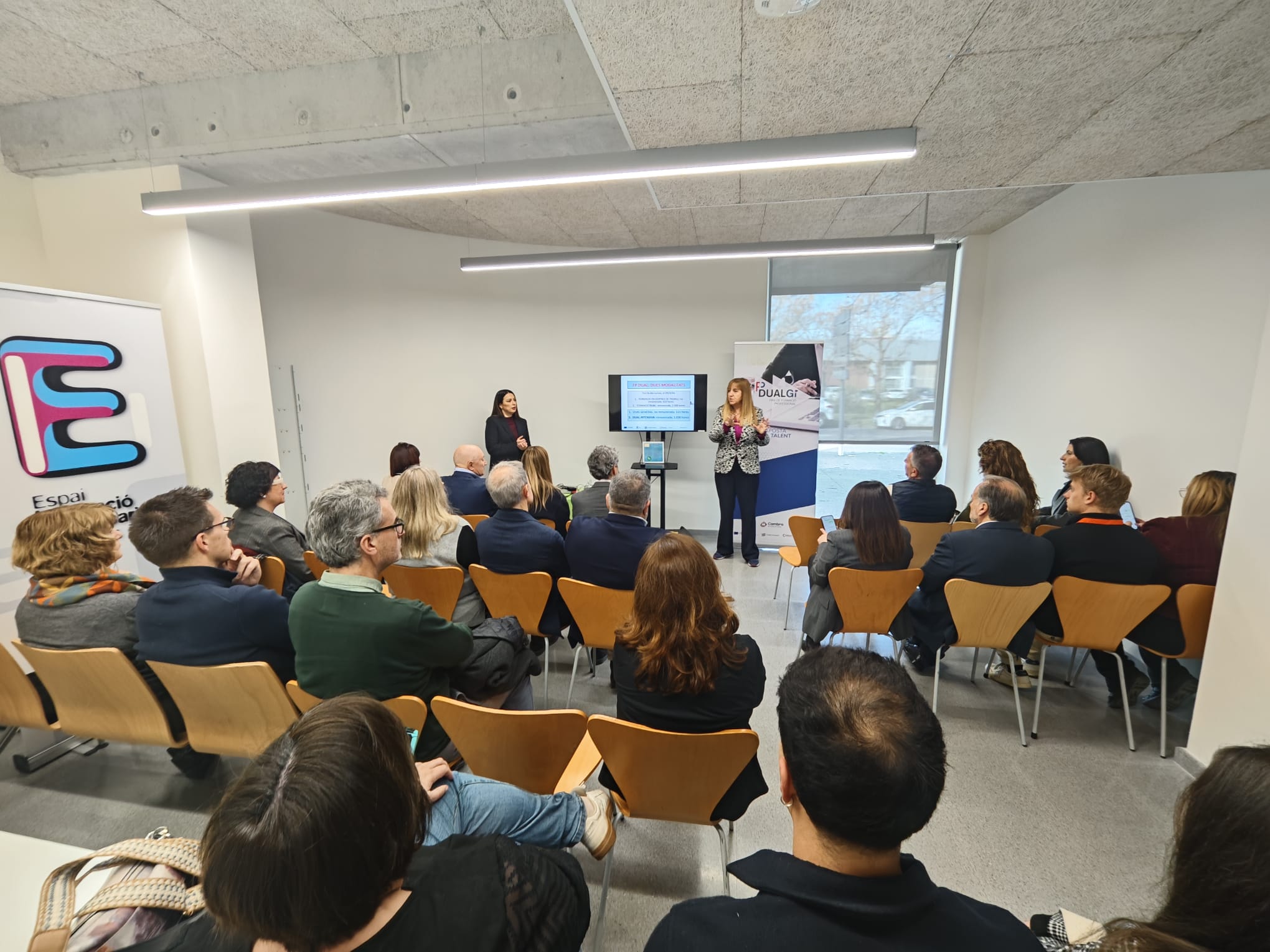 A la jornada del passat 11 de març la xerrada adreçada a les empreses va anar a càrrec de l’Assumpció Cullell, coordinadora dual del nostre institut Cap Norfeu, qui va aportar la visió acadèmica i l’experiència en la gestió del talent jove, i d’Esther Martín, en representació de l’empresa Calsina Carré, qui va compartir l’èxit de la implementació de l’FP Dual des de la vessant empresarial.