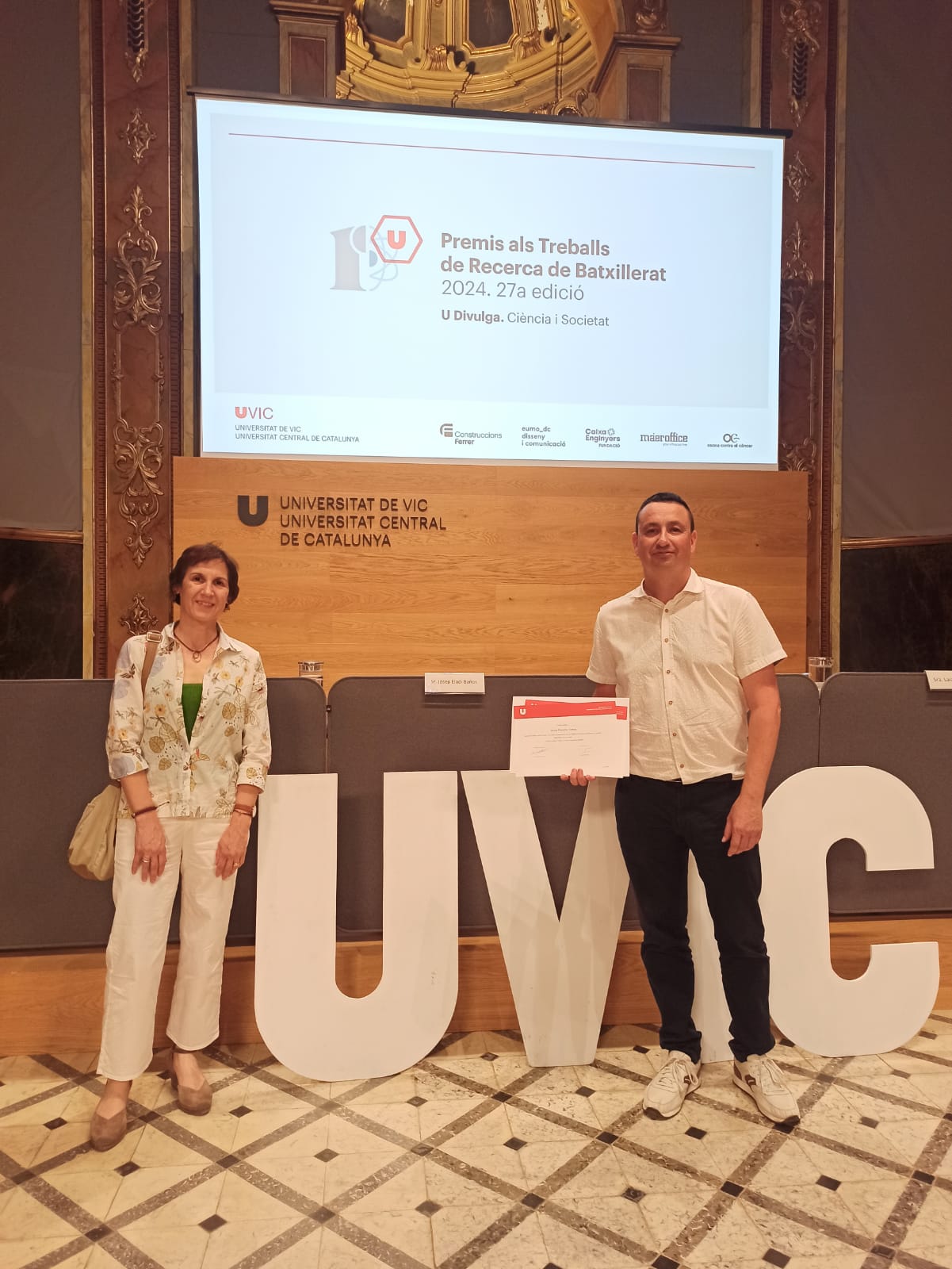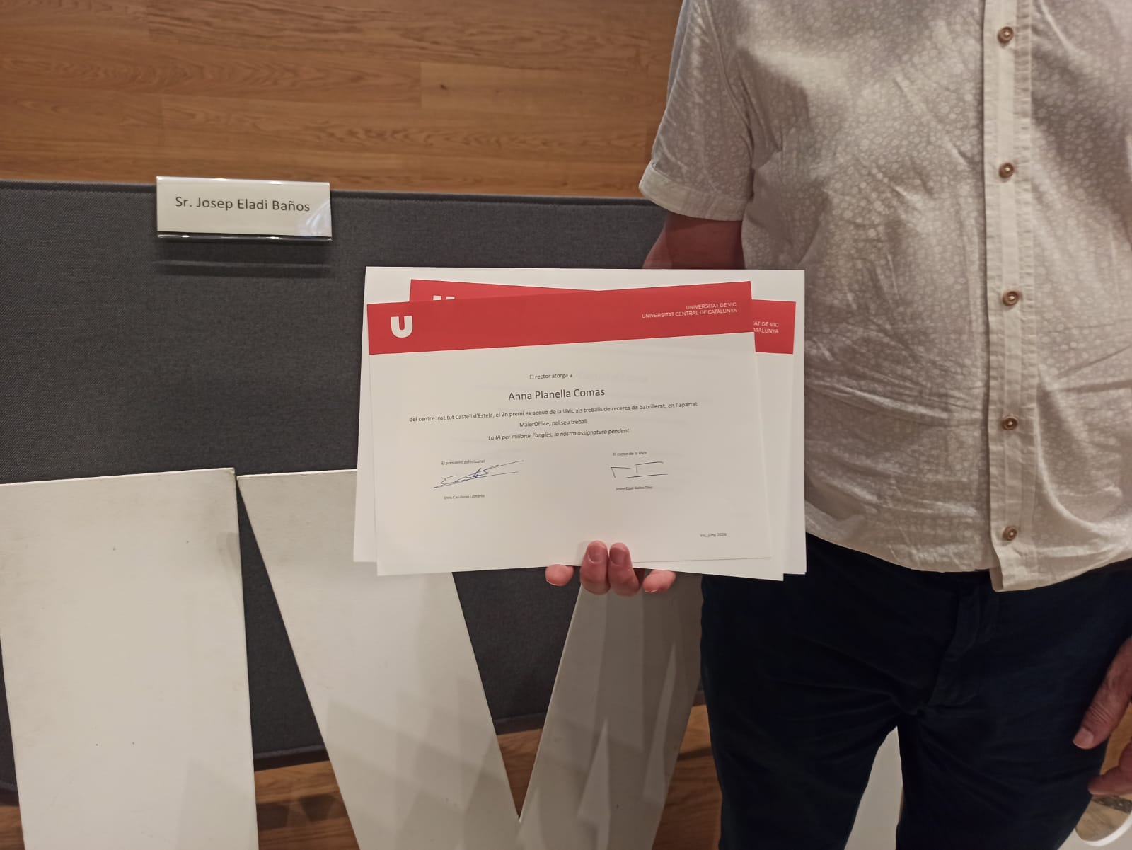 L’Acte de lliurament de Premis es va celebrar el dimarts 25 de juny de 2024 a les 18:00h al Paraninf de la UVic. L’Anna no hi va poder assistir i va recollir el premi el seu pare.