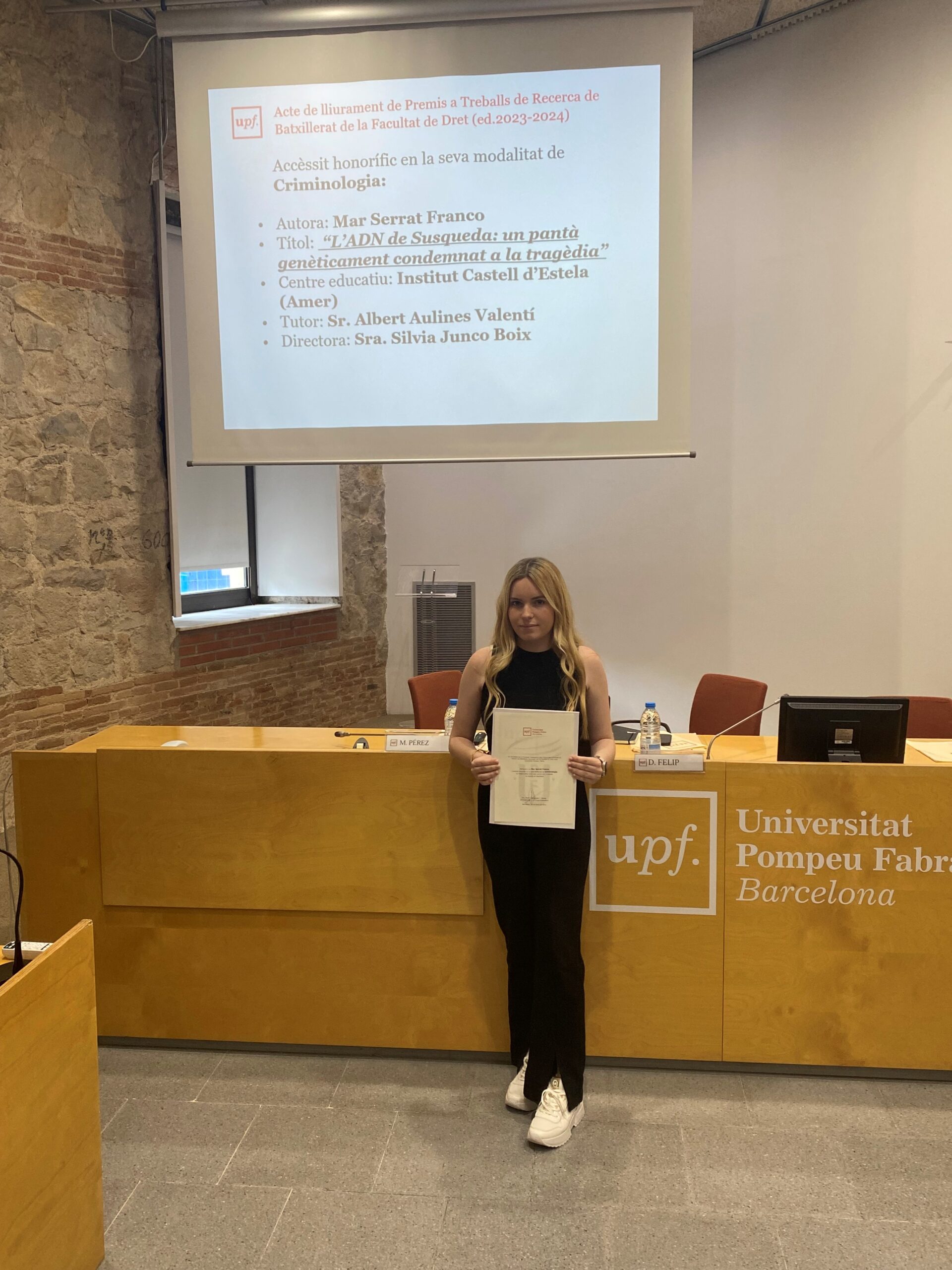 La nostra alumna de 2n de Batxillerat humanístic i social Mar Serrat amb el seu treball: L’ADN de Susqueda, un pantà genèticament condemnat a la tragèdia, tutelat pel professor Albert Aulines, ha guanyat l’accèssit honorífic en la modalitat de Criminologia.