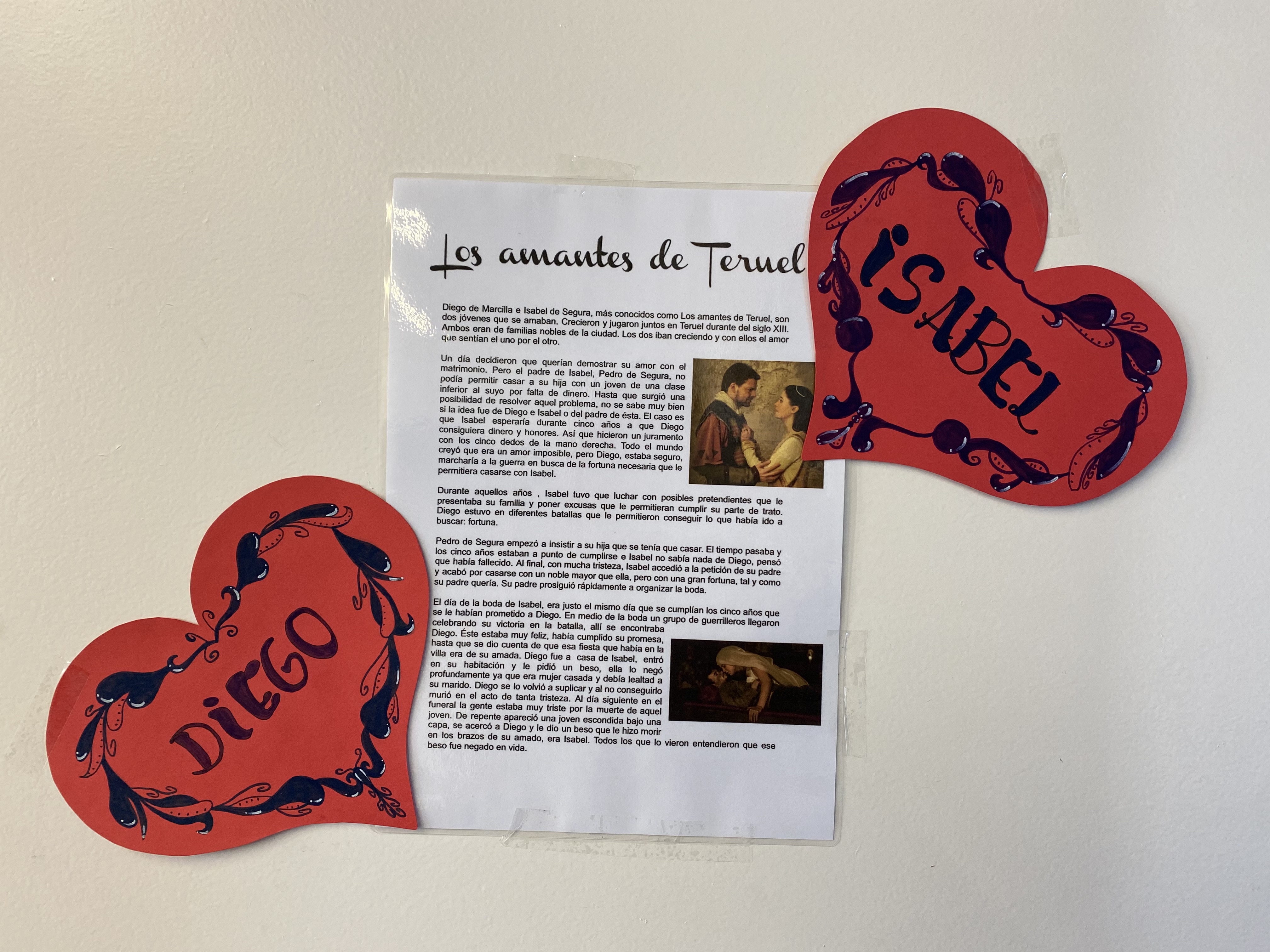 En las clases de 2º de ESO hemos trabajado por parejas las grandes historias de amor de la Literatura Universal. Los alumnos debían buscar información sobre quiénes eran, qué les pasó y por qué. Después de recabar los datos, se trataba de exponerlos en un DN3 o una cartulina y colocar dos corazones con el nombre y la imagen de los enamorados.