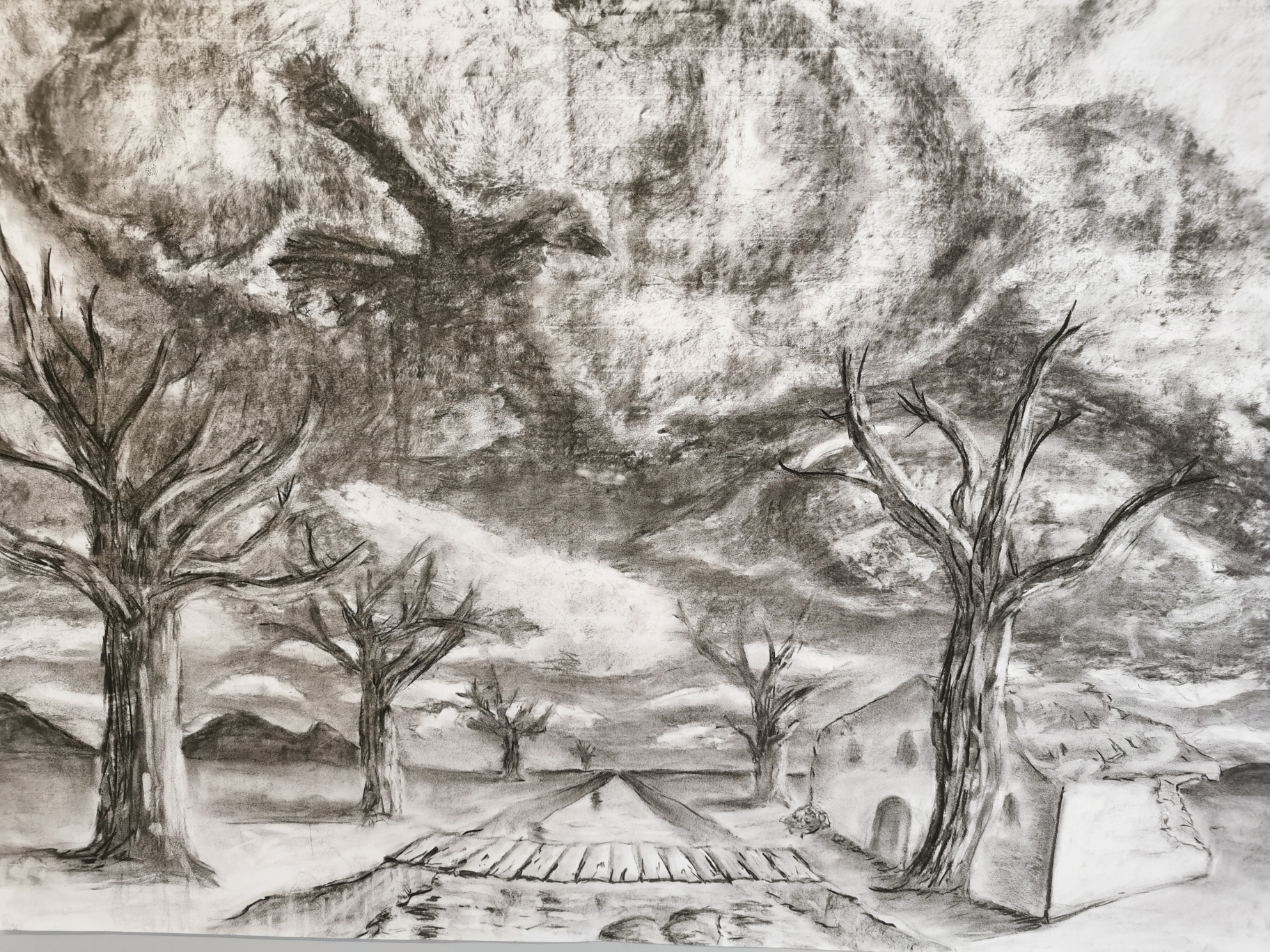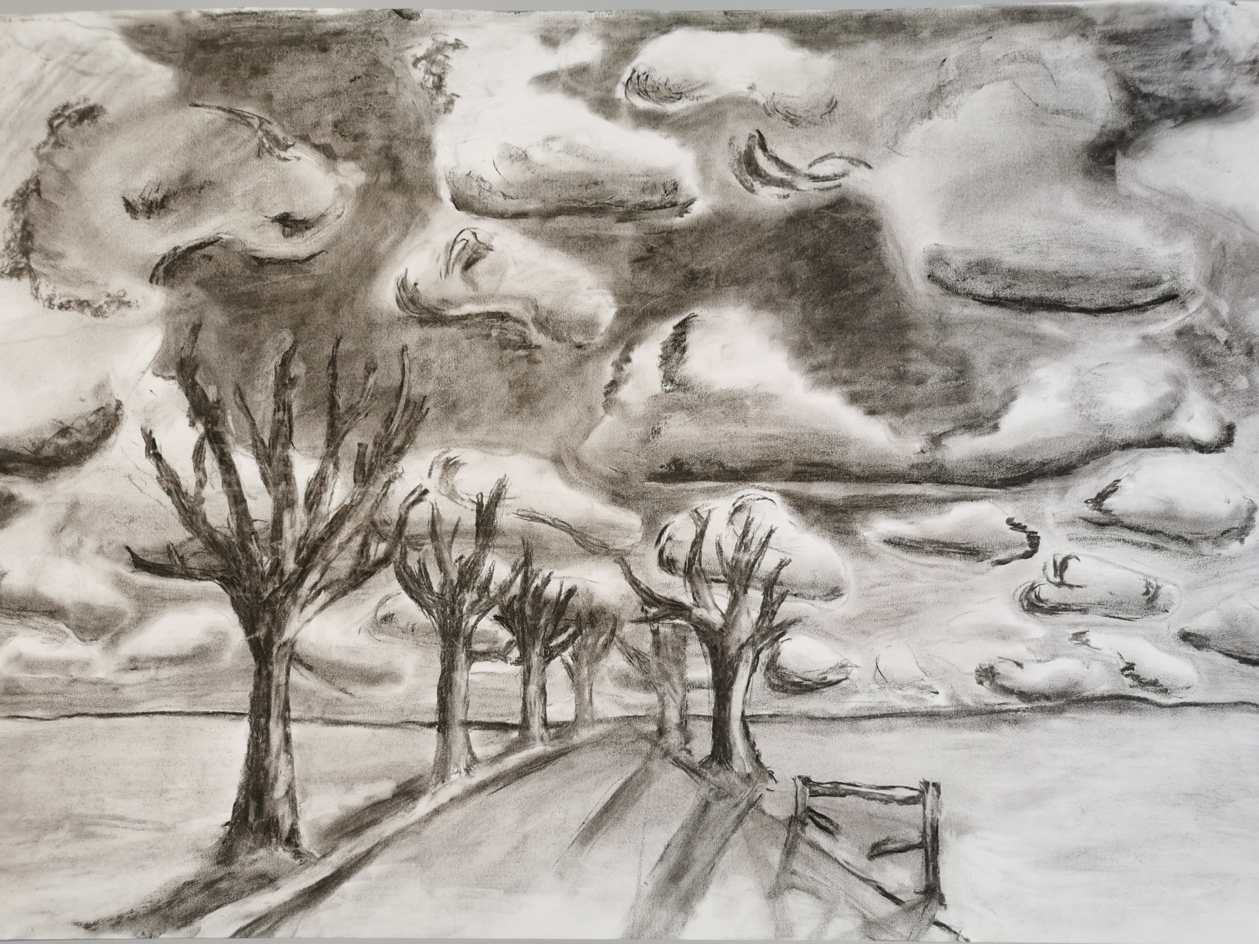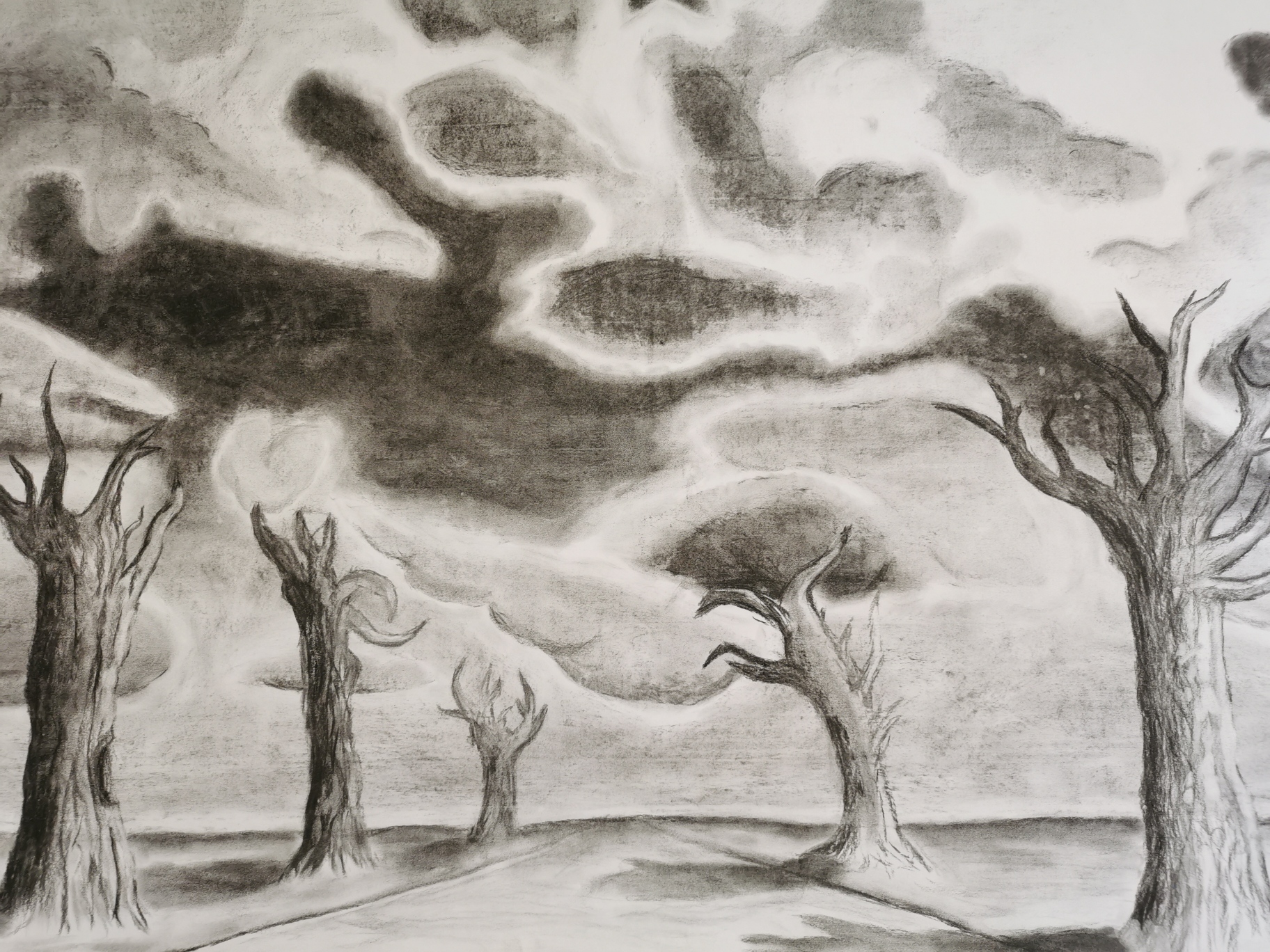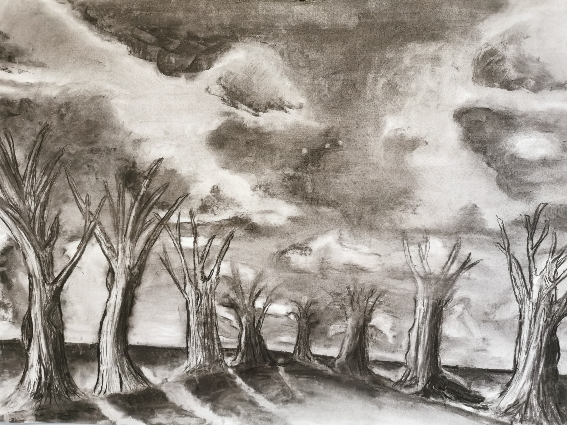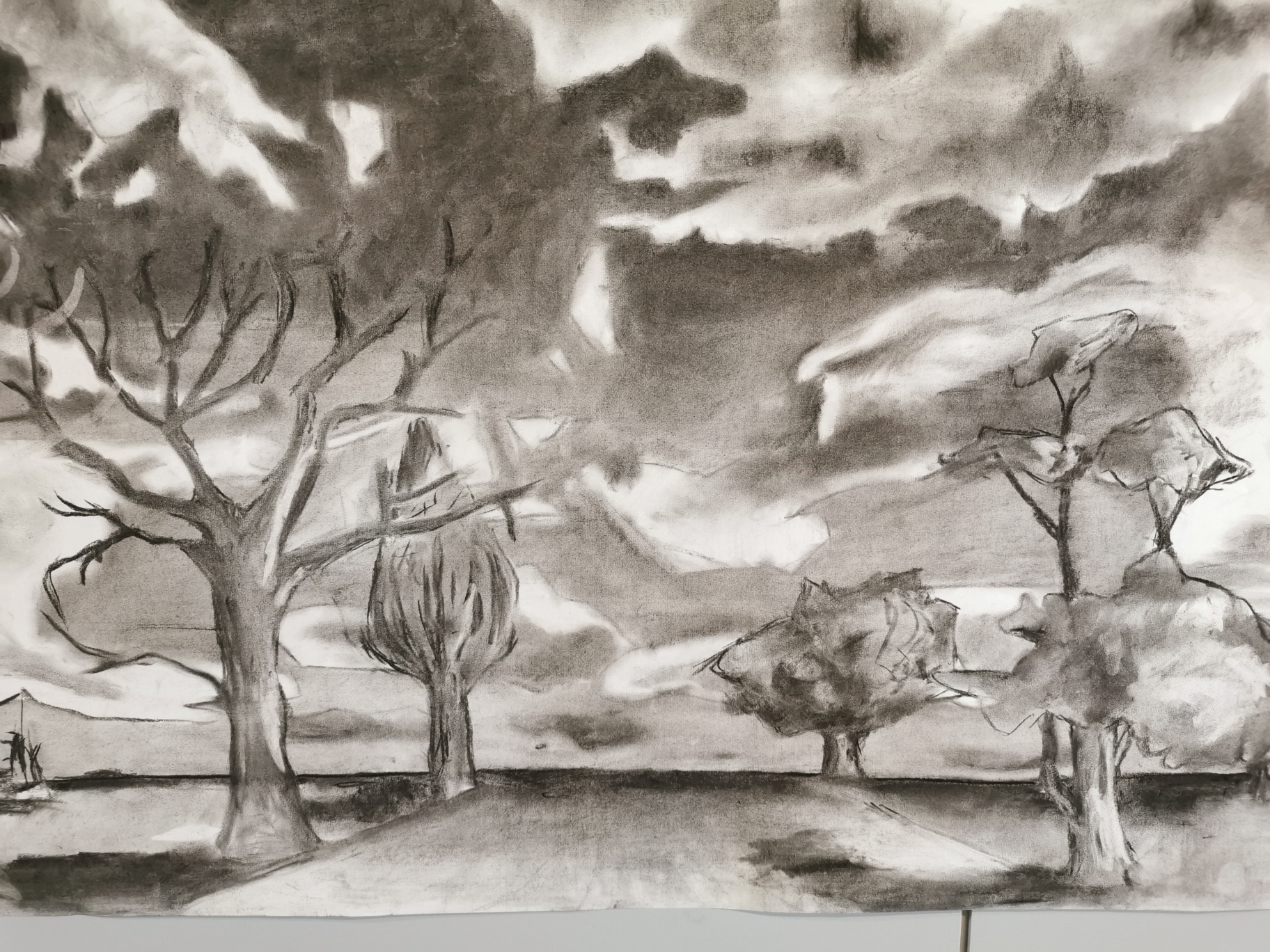 Paisatges ; Estudi del clarobscur observat en els núvols amb la tècnica del carbonet , la perspectiva i la textura dels arbres en el paisatge.
