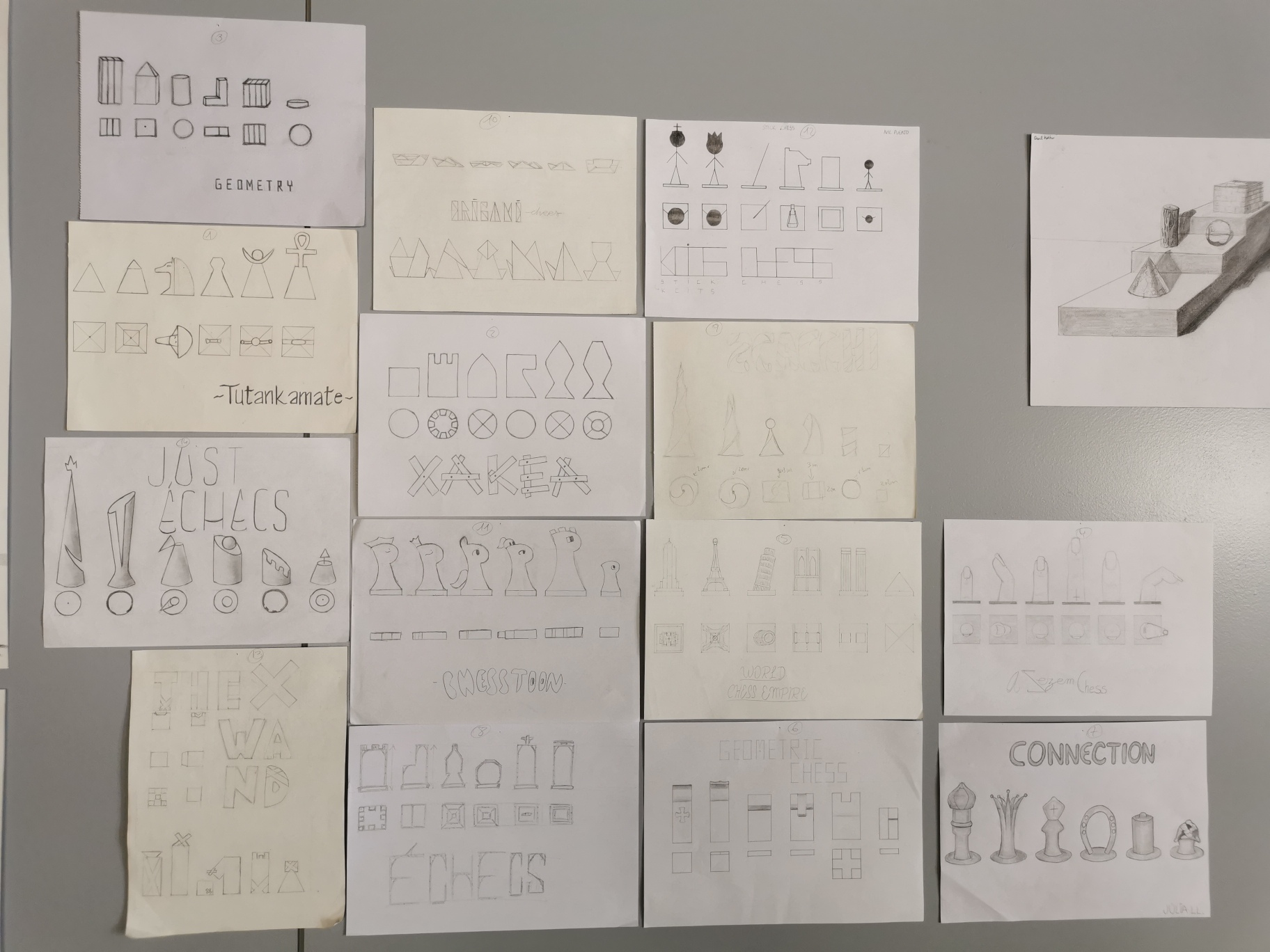 1r de Batxillerat.Escales : perspectiva cònica d’una escala amb estudi de clarobscur i diferents textures d’ objectes polièdrics.