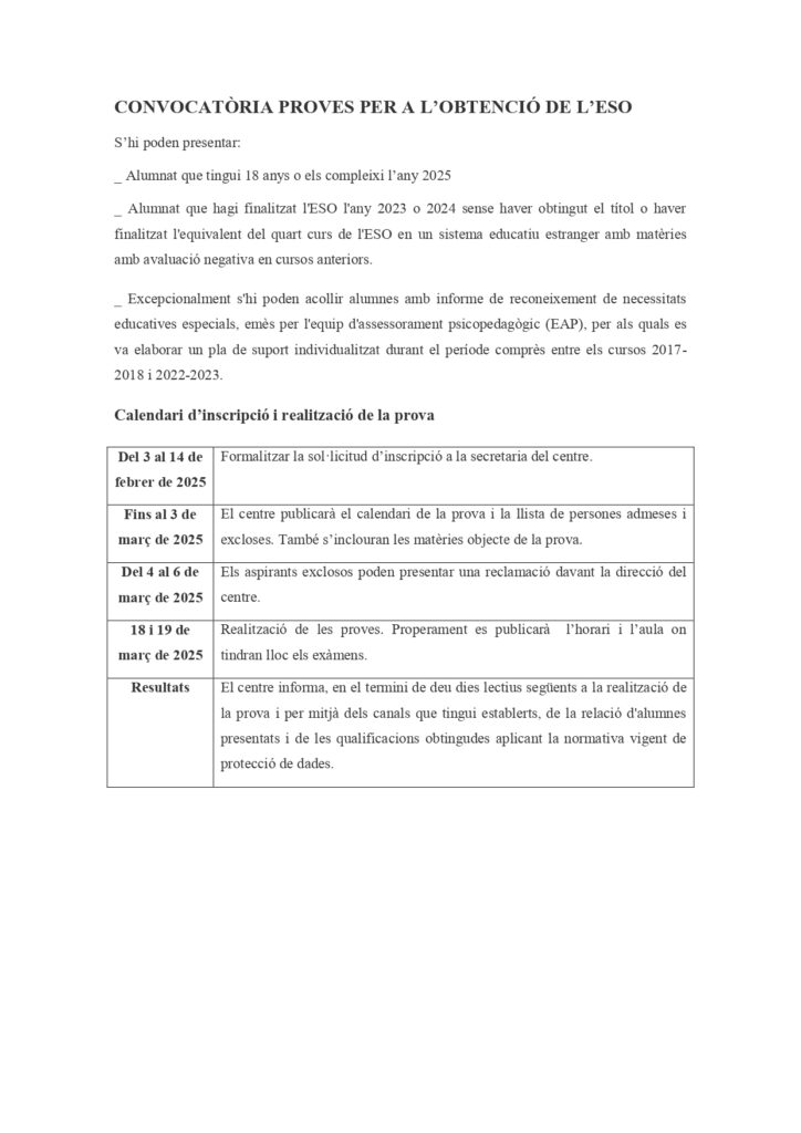 Proves per a l’obtenció del graduat en ESO – 18/19 març 2025