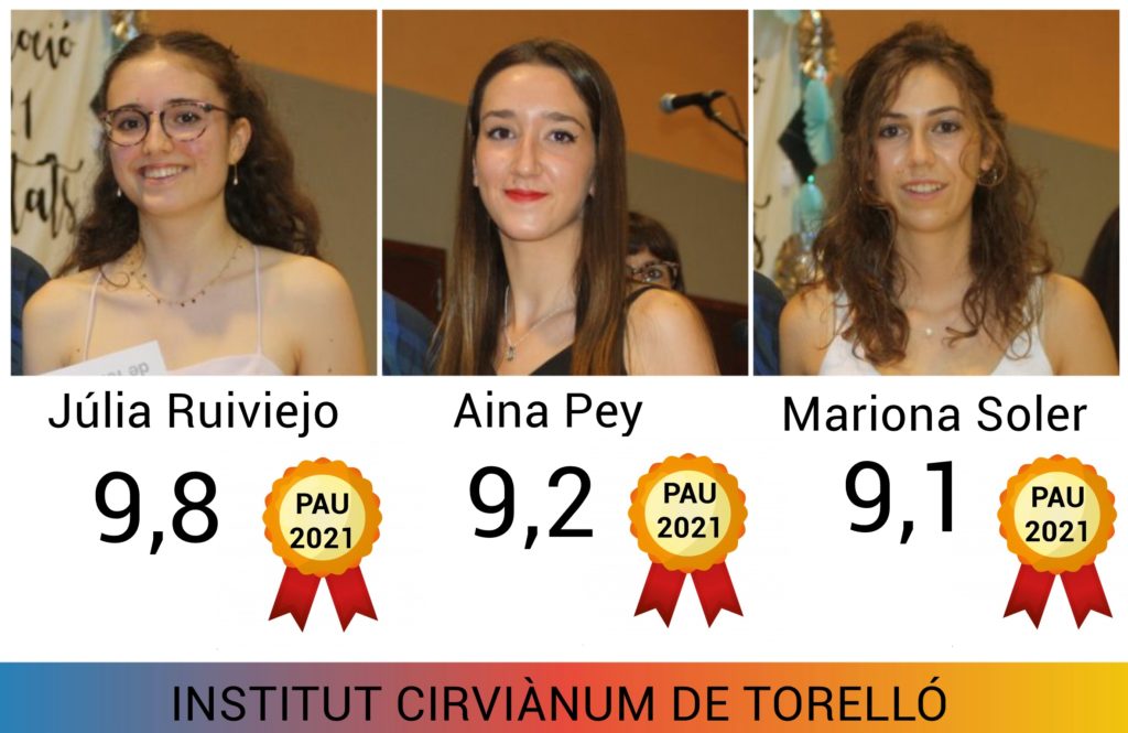 El professorat de l’Institut Cirvianum vol reconèixer els resultats a les PAU a: Júlia Ruiviejo (9’8), Aina Pey (9’2) i Mariona Soler (9’1). Enhorabona cracks!!!!