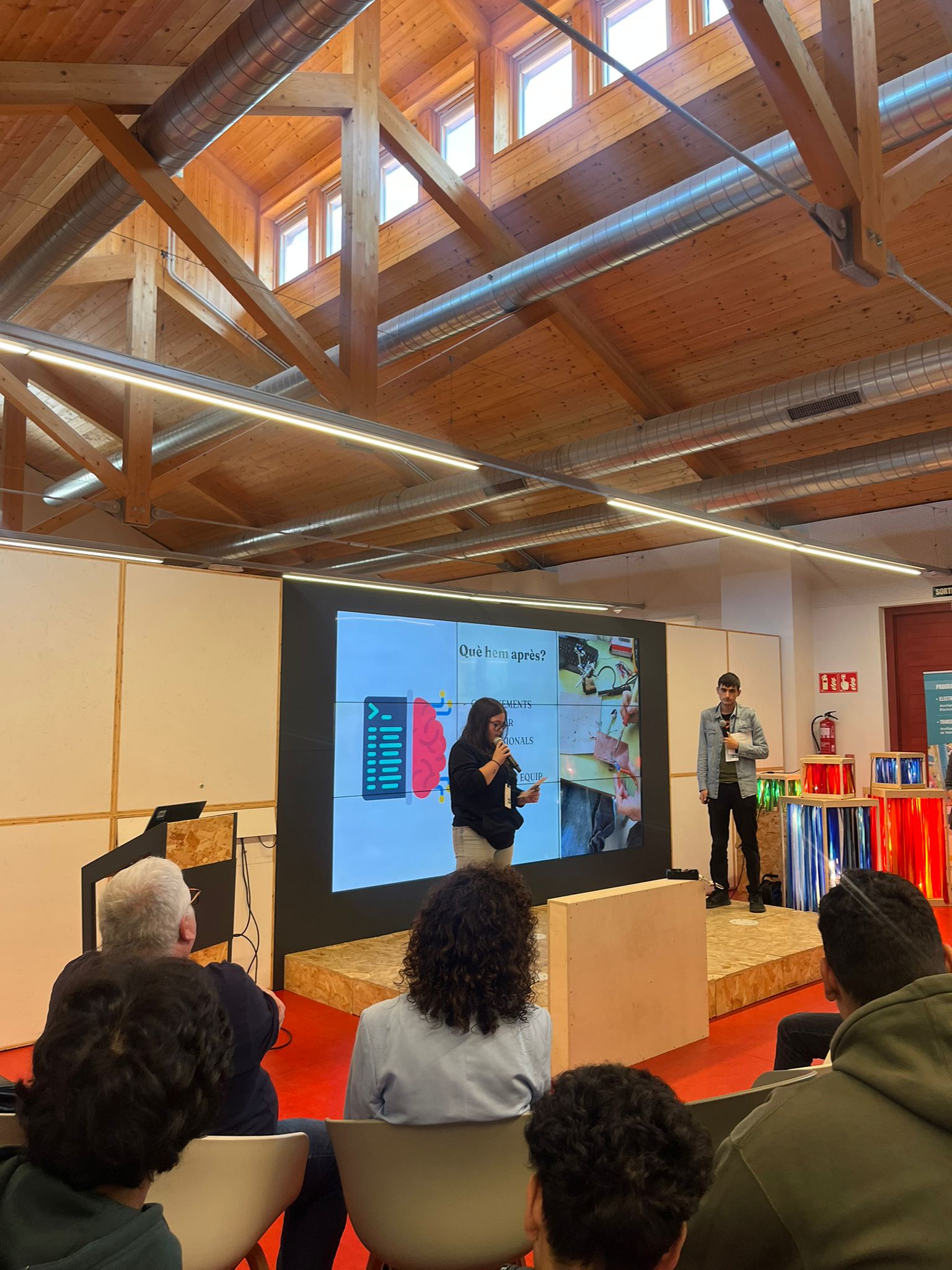 Després de les presentacions, els participants han pogut gaudir de tallers pràctics organitzats per T-Systems, 42 Barcelona – Fundació Telefònica, Eurecat Academy i Draco Systems. A banda d’uns tallers de realitat virtual i d’art i fusta. Dividits en grups, els joves han pogut experimentar de primera mà com es treballa amb intel·ligència artificial, robòtica, fabricació additiva, realitat virtual i sistemes electrònics intel·ligents.