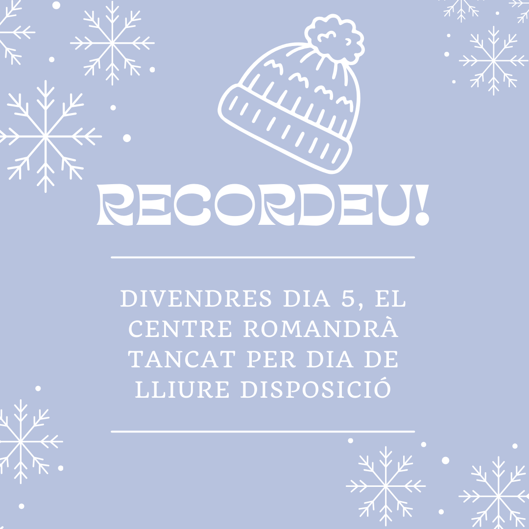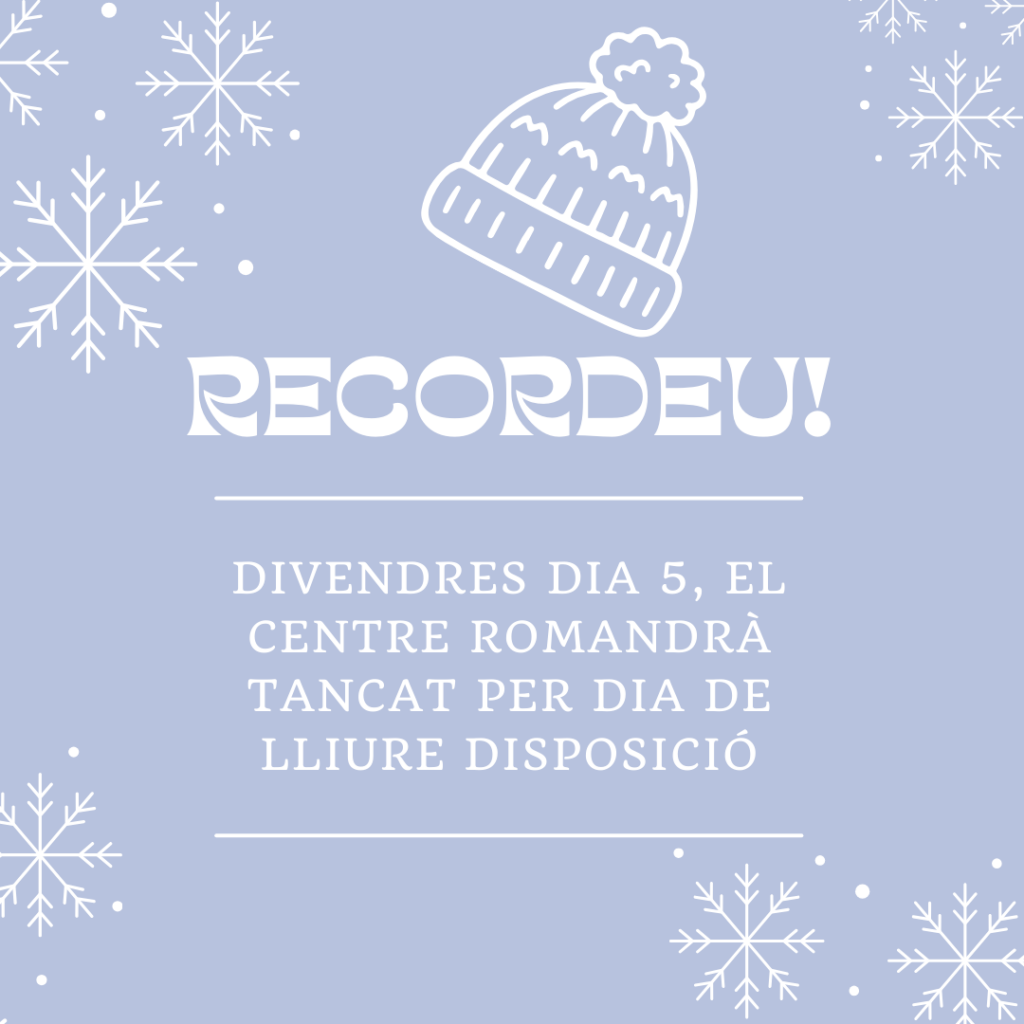 Us informem que divendres, dia 5 de desembre de 2025, el centre romandrà tancat per dia de lliure disposició.