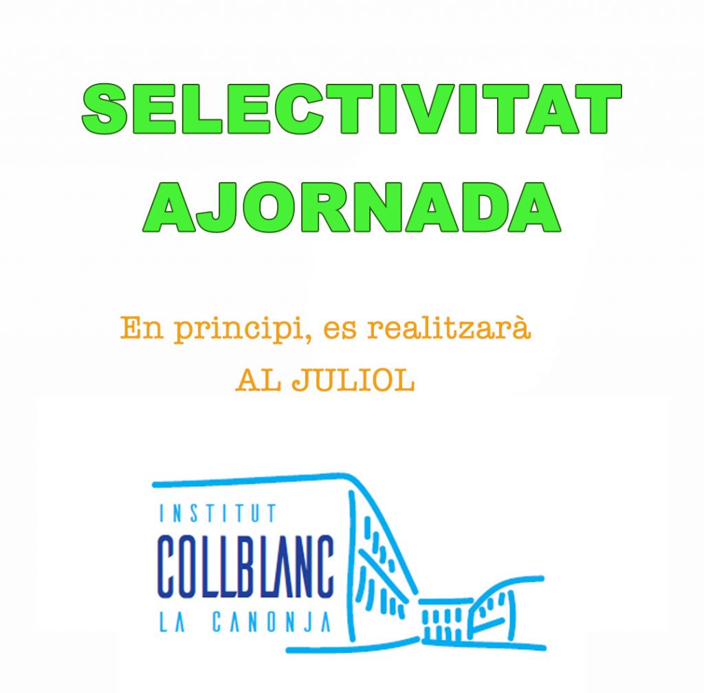 Selectivitat ajornada Feu un comentari / Per admin / 21/03/2020 / Batxillerat General Portada Les proves de selectivitat queden ajornades fins al mes de juliol, en principi. Encara no sabem fins quan hi haurà classes de 2n de Batxillerat.
