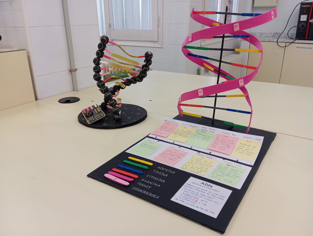 Durant el mes de desembre, l’alumnat de 2n de Batxillerat de l’assignatura de Biologia ha construït una maqueta tridimensional de l’àcid desoxiribonucleic (ADN), la molècula que conté el nostre material genètic. Aquesta activitat no només ha consistit a replicar l’estructura de la doble hèlix, sinó a reproduir meticulosament totes les molècules i enllaços químics que