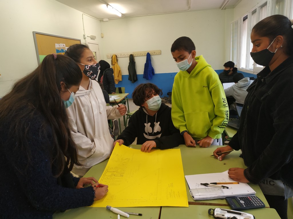 Dins del marc de la geometria estem treballant el Teorema de Pitàgores. Hem baixat al pati, hem fet mesures amb la cinta mètrica i el teodolit i ara totes les dades les treballarem a l’aula.