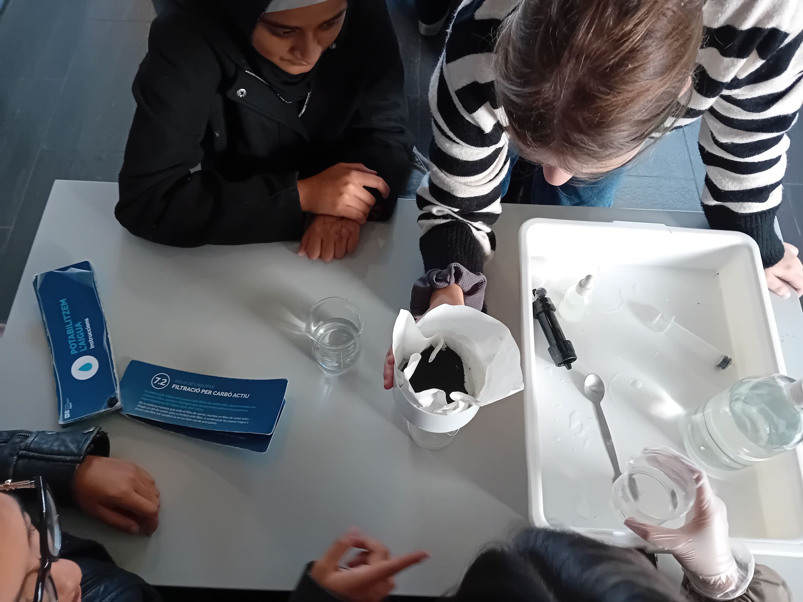 En el taller, dirigit pel monitor Biel, els alumnes van simular les principals etapes de potabilització, com la coagulació i decantació, la filtració amb sorra, el tractament amb carbó actiu, l’osmosi inversa i la posterior remineralització amb calcita. Finalment, van aprendre la importància de la cloració com a garantia sanitària.