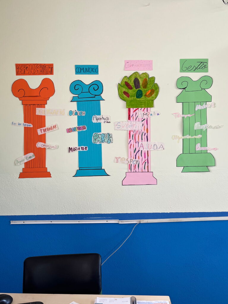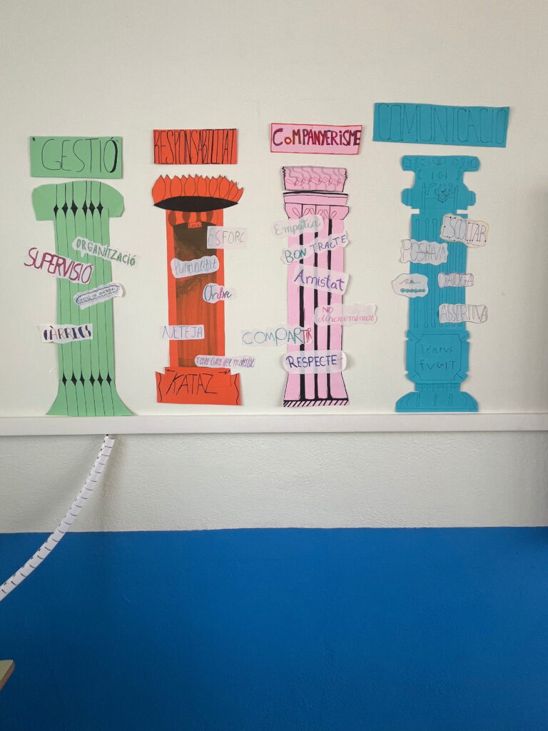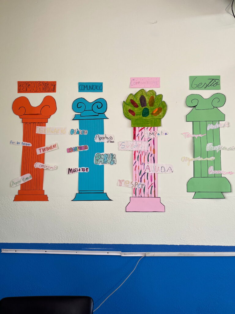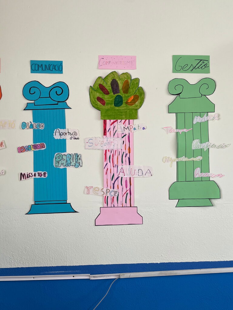 Com que l’alumnat inicia etapa i encara no es coneix, hem volgut reflexionar plegats sobre quins són els pilars del treball en equip: el respecte, l’escolta, la responsabilitat, la cooperació i la confiança. Ho hem fet des del llenguatge visual, utilitzant els pilars grecs com a símbol d’allò que sosté un grup i el fa créixer.