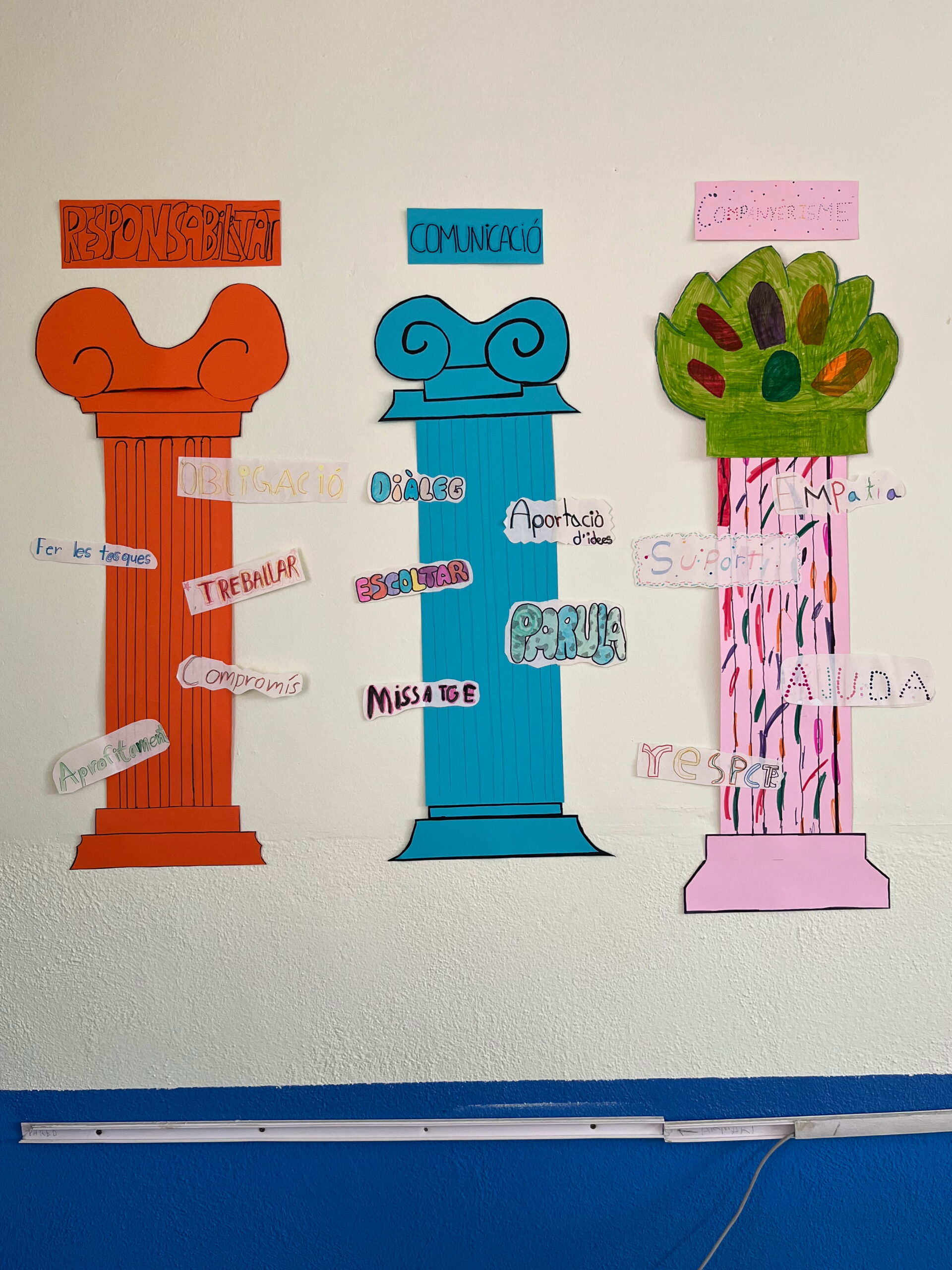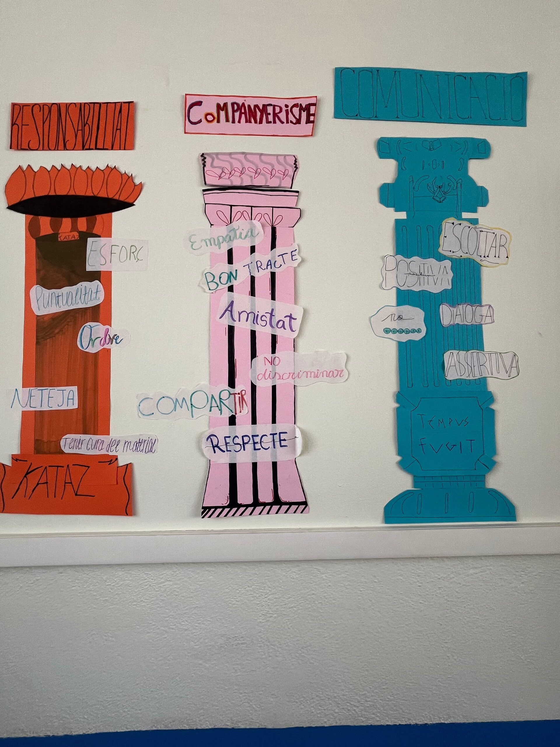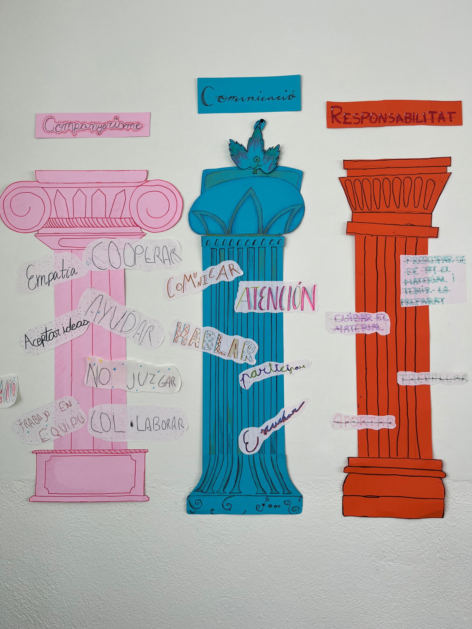 Com que l’alumnat inicia etapa i encara no es coneix, hem volgut reflexionar plegats sobre quins són els pilars del treball en equip: el respecte, l’escolta, la responsabilitat, la cooperació i la confiança. Ho hem fet des del llenguatge visual, utilitzant els pilars grecs com a símbol d’allò que sosté un grup i el fa créixer.