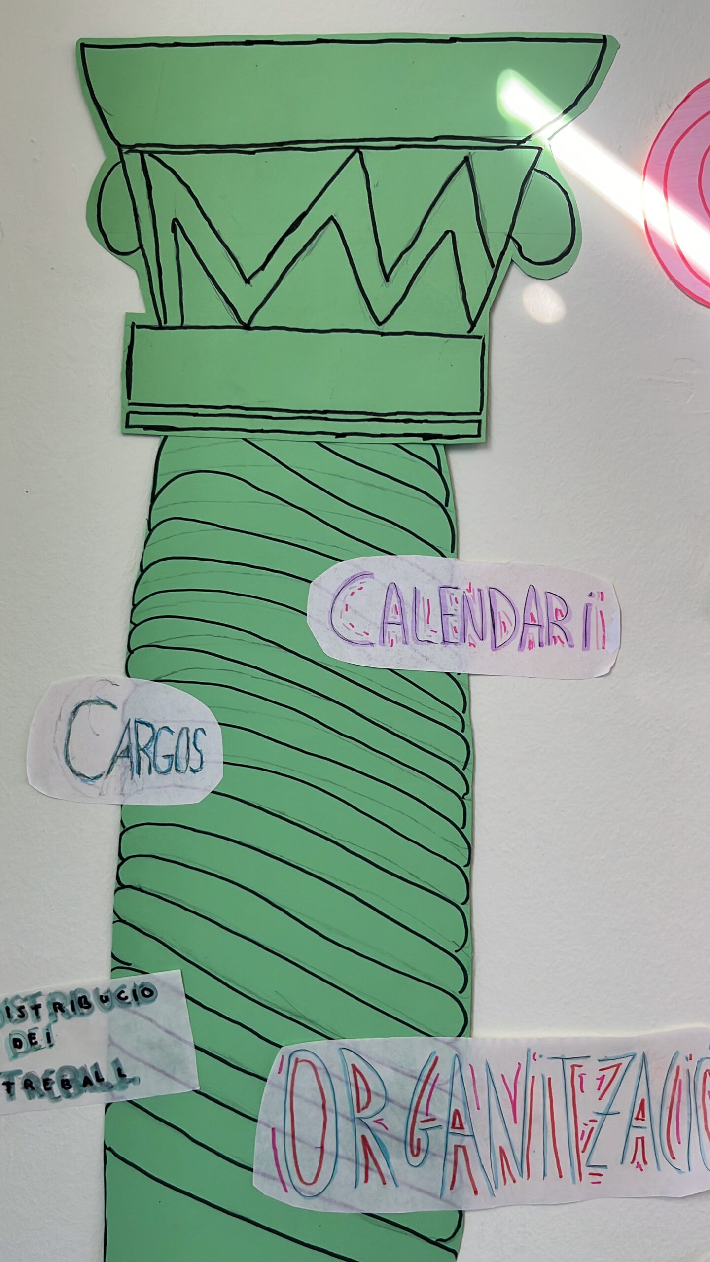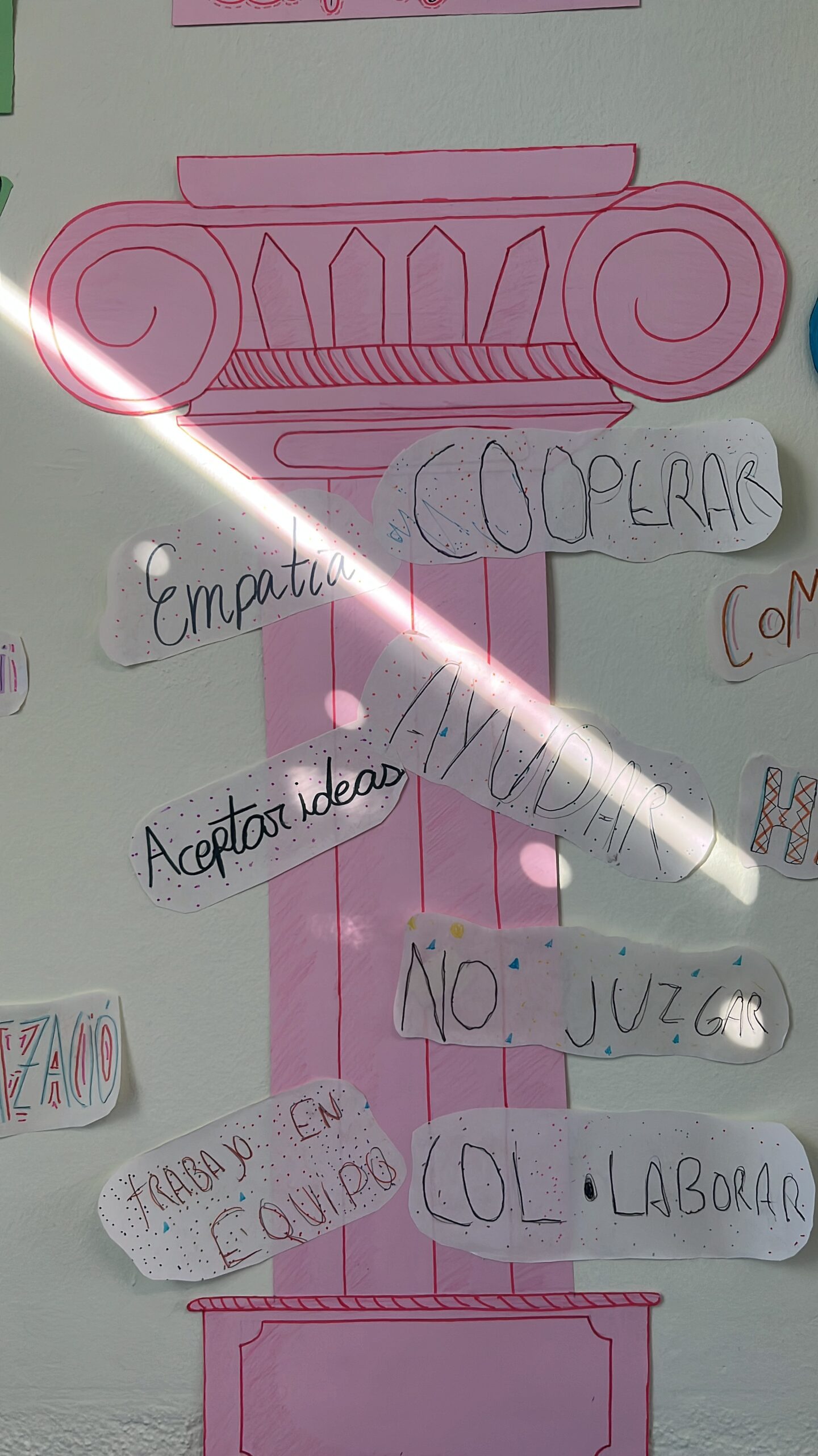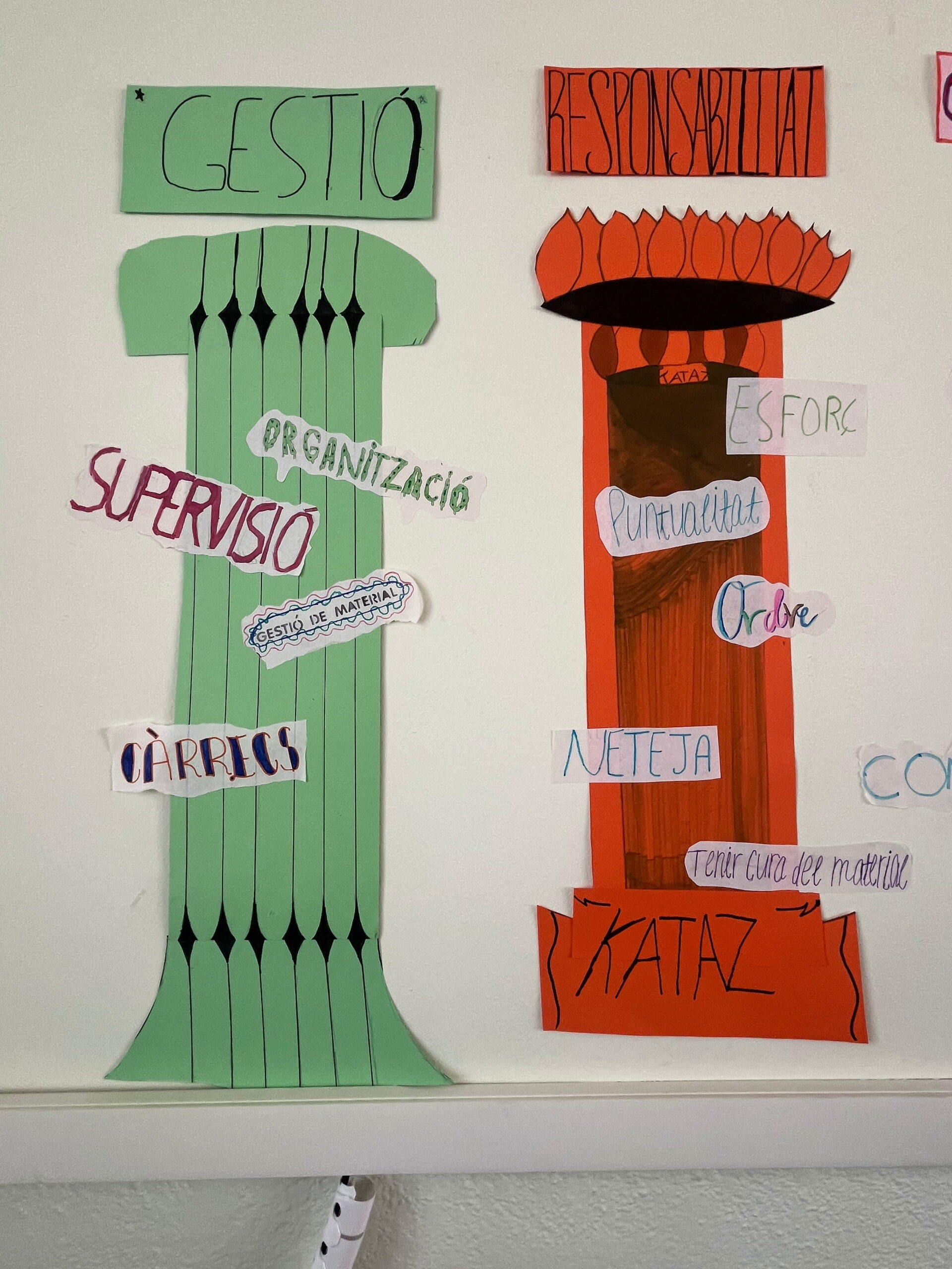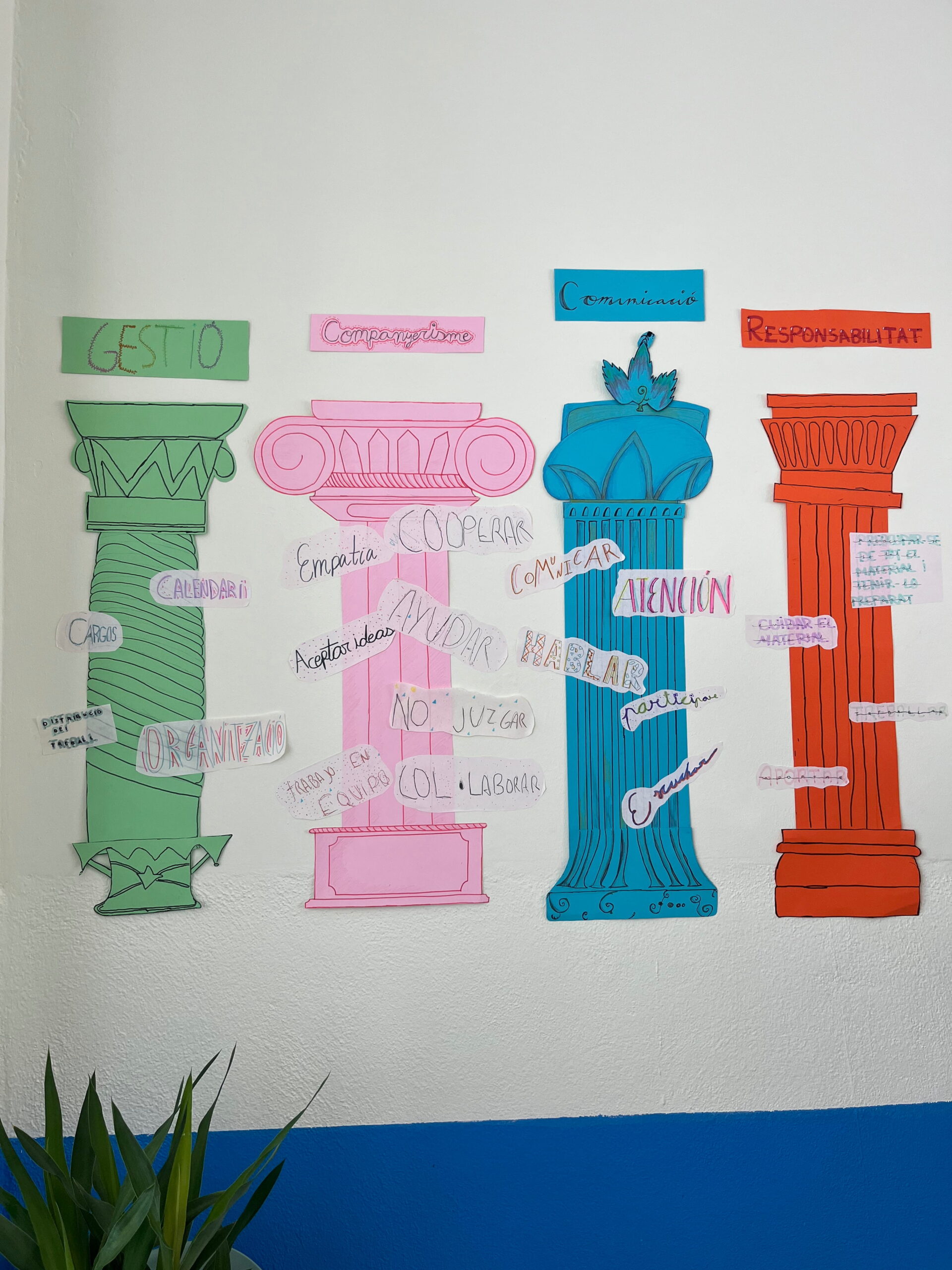 Com que l’alumnat inicia etapa i encara no es coneix, hem volgut reflexionar plegats sobre quins són els pilars del treball en equip: el respecte, l’escolta, la responsabilitat, la cooperació i la confiança. Ho hem fet des del llenguatge visual, utilitzant els pilars grecs com a símbol d’allò que sosté un grup i el fa créixer.