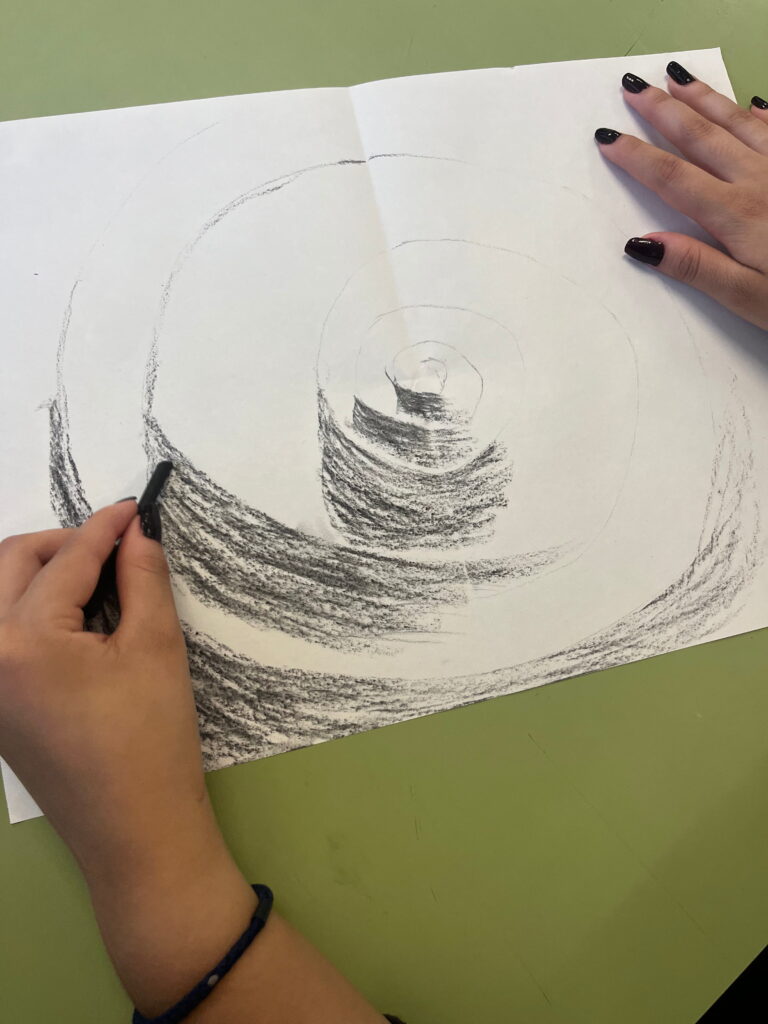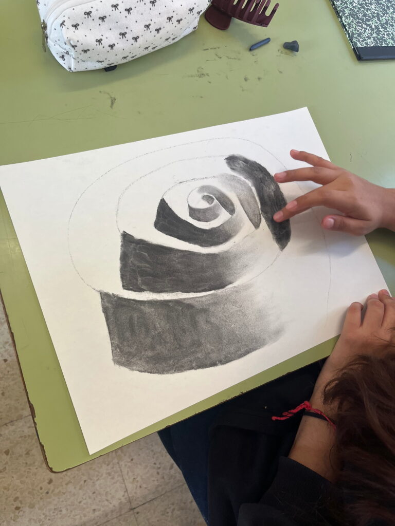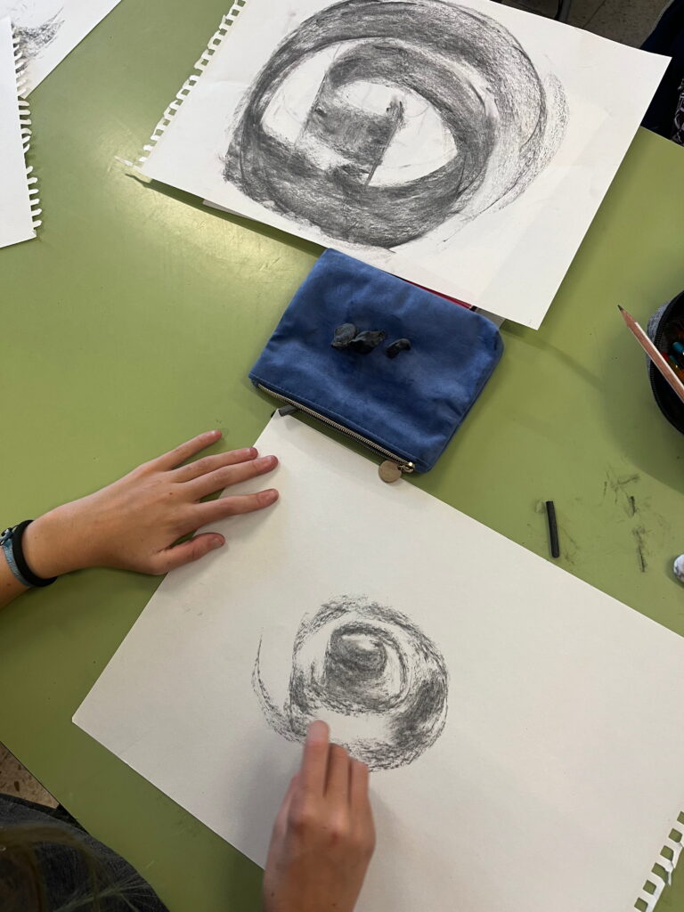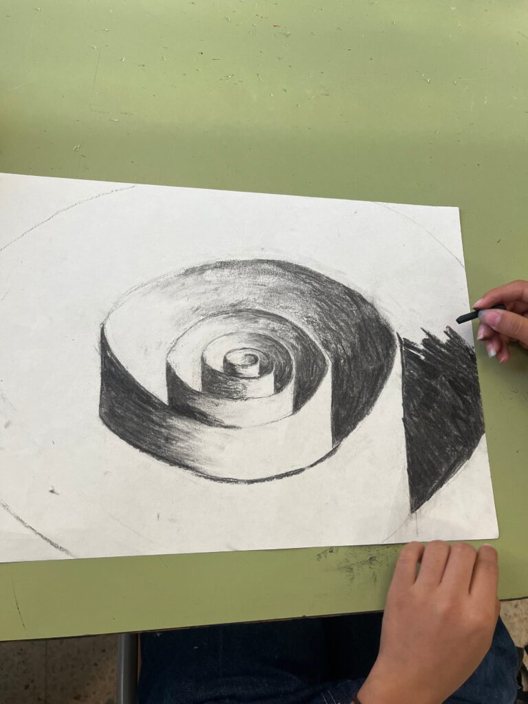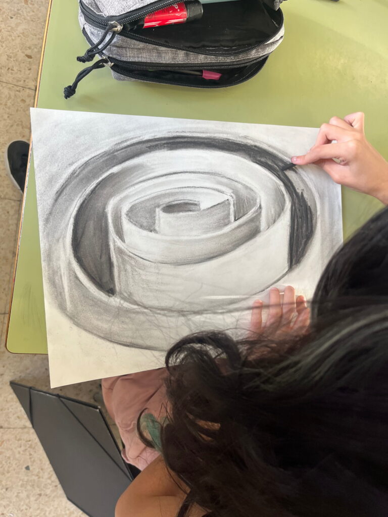 L’alumnat ha treballat la llum i l’ombra, els valors tonals i les transicions suaus per donar profunditat, pes i presència a les formes. El carbonet ens ha permès explorar el gest, el contrast i la matèria del dibuix, entenent el to com a eina fonamental per representar l’espai.