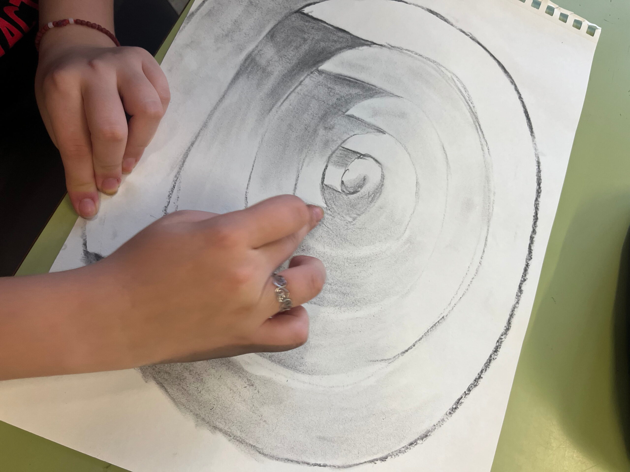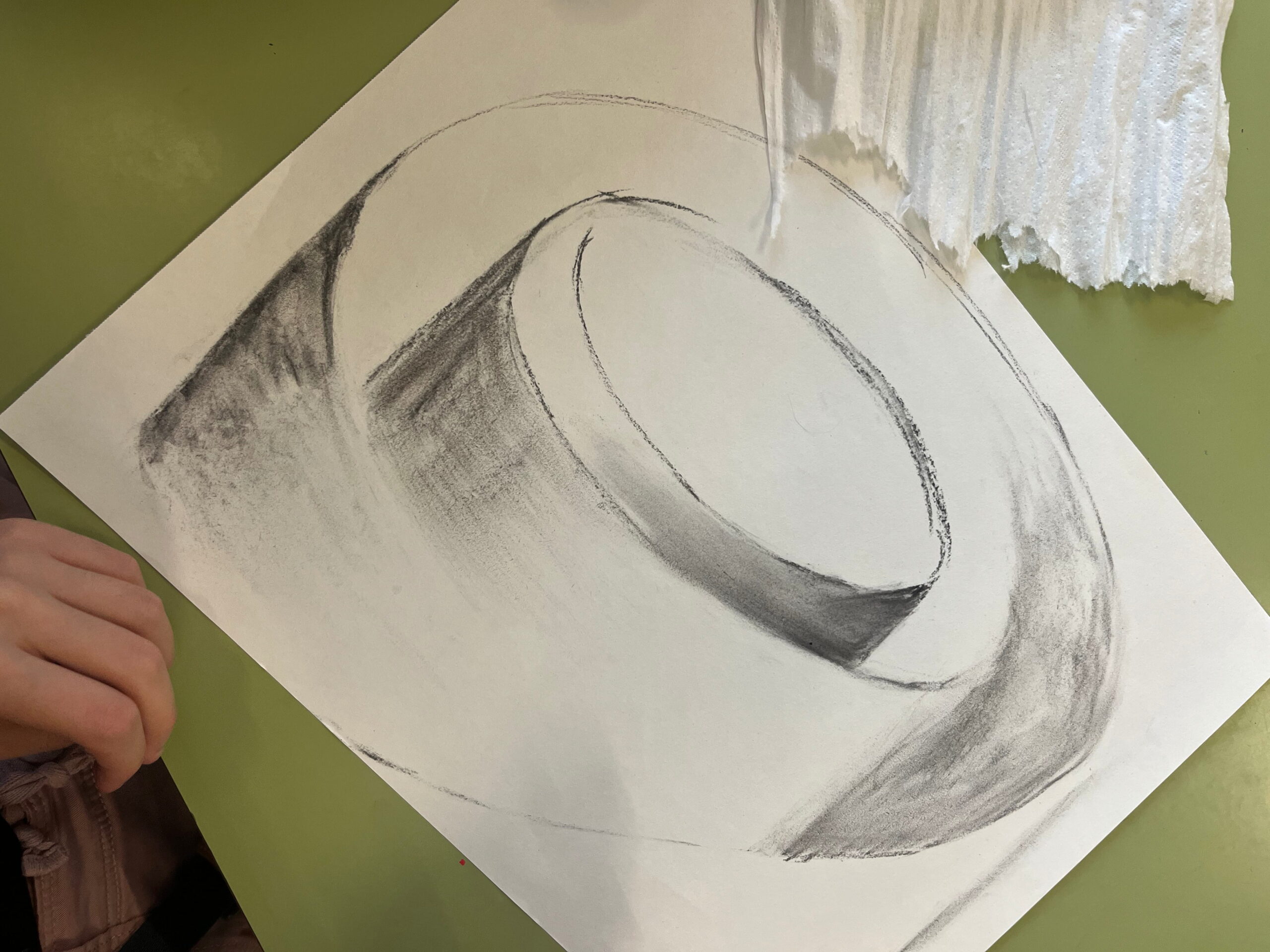L’alumnat ha treballat la llum i l’ombra, els valors tonals i les transicions suaus per donar profunditat, pes i presència a les formes. El carbonet ens ha permès explorar el gest, el contrast i la matèria del dibuix, entenent el to com a eina fonamental per representar l’espai.