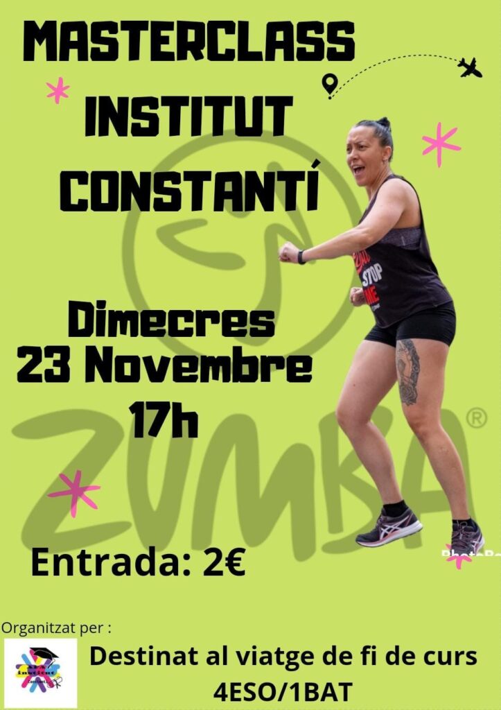El proper dimecres 23 de novembre a les 17:00 h de la tarda, tindrà lloc a l’Institut de Constantí una MasterClass de Zumba amb un preu d’entrada de 2 €. Ha estat organitzat per l’AFA de l’institut, i la recaptació estarà destinada al viatge de fi de curs de l’alumnat de 4t d’ESO i 1r de Batxillerat.