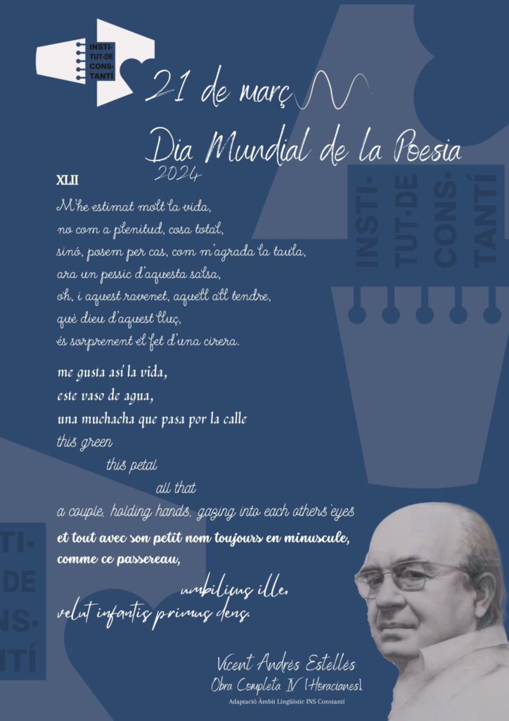 Avui, 21 de març, celebrem el Dia Mundial de la Poesia, entre altres activitats, amb la decoració de les escales del nostre centre. L’alumnat de 3r d’ESO PDC han sigut els encarregats i encarregades de dur a terme aquesta tasca. Aquest any, es dedica el dia al poeta valencià Vicent Andrés Estellés amb el seu […]