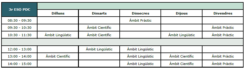 Horari 3r ESO Projecte de Diversificació Curricular Feu un comentari / Per admin / 31/08/2016 / ESO 3 PDDC