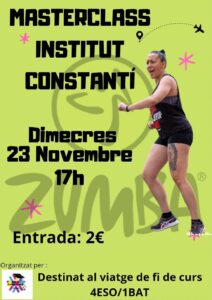 El proper dimecres 23 de novembre a les 17:00 h de la tarda, tindrà lloc a l’Institut de Constantí una MasterClass de Zumba amb un preu d’entrada de 2 €.
