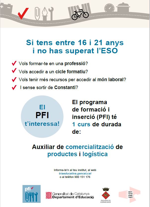 En el marc de la celebració del 25è aniversari de la creació del centre, tenim un nou repte: l’augment de l’oferta educativa per al proper curs en implantar un Programa de Formació i Inserció (PFI), en concret, auxiliar de comercialització de productes i logística.