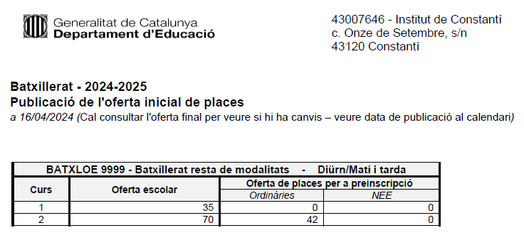 Oferta inicial de places de Batxillerat, curs 2024-25 Feu un comentari / Per Mercè Grané / 17/04/2024 / General Portada